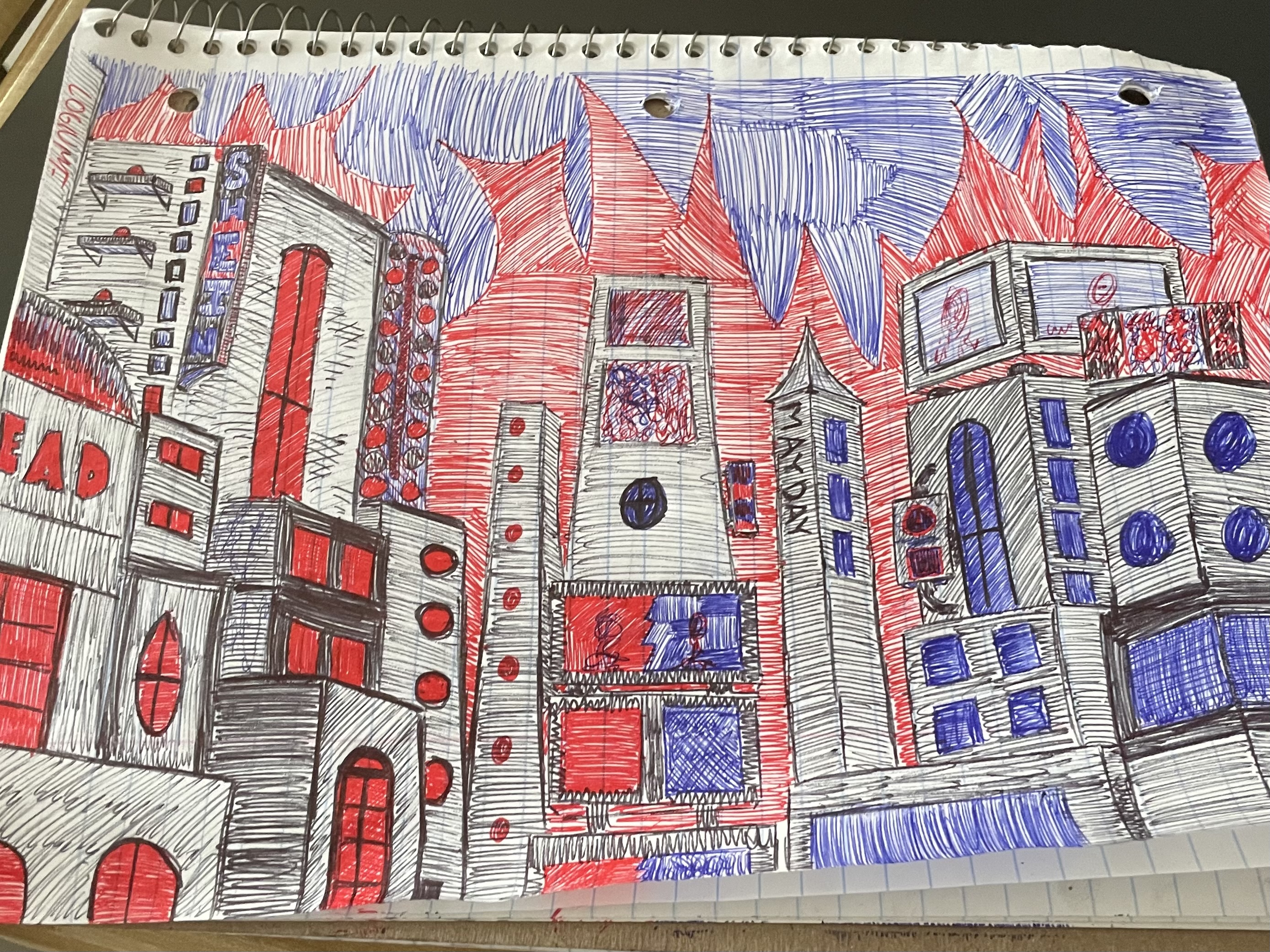 This piece of art, titled The City of Confliction is my attempt at a visual representation of a section of the book The Handmaid’s Tale, by Margaret Atwood. It features a tall cityscape from the perspective of somebody standing on the ground, looking up. There are red or blue details on the buildings depending on where you look, and in the background flames are rising tall above the buildings, contrasting against an oddly calm, blue sky. The scene from the book I chose to base my artwork off of was the Manhattan cleanup, a riot/protest of sorts, where pro-Gilead radicals took to Times Square, burning, destroying, and denouncing people and things they saw unfit for their ideal society. They burnt clothes and humiliated those responsible for their design and manufacture.