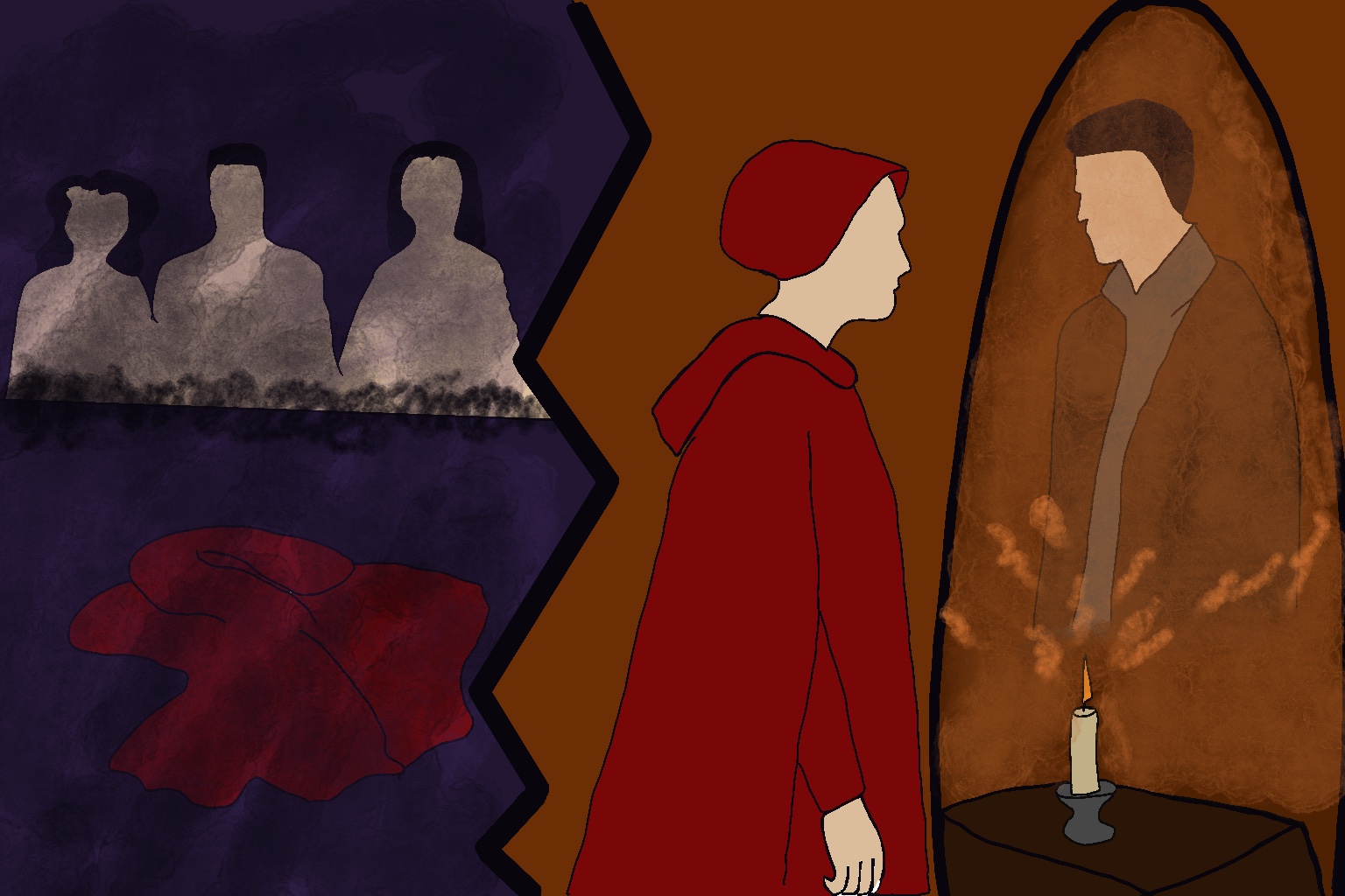 Left Side: The Ceremony The left side of the art work is repressing the ceremony that contains Offred, the commander, and Serena Joy. The room is suffocating, filled with darkness. It has tones of purple and black as well. The room has this type of energy coming from it because it represents the awkward and uncomfortableness of the ceremony. The ceremony is a sexual experience but there is no love coming from it. In the center of the art work there is a red handmaid’s cloak that is crumpled up. The cloak symbolizes Offred’s body being used as an object rather than a human being. Above the cloak you can see the silhouettes of the commander, Serena Joy, and Offred. They’re faceless because it represents the loss of individuality in Gilead.