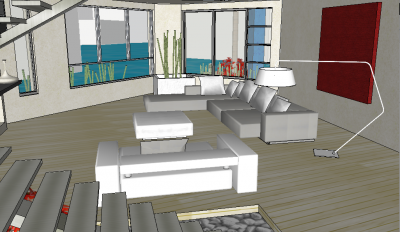 Una sala elegante con sofás, cómodo, y ventanas enormes.