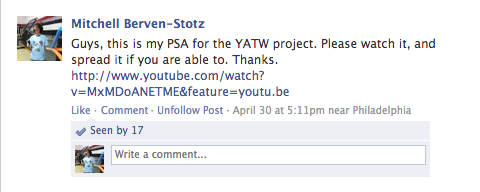 For the final part of my You and the World project, I created a minute and a half long public service announcement on the problems of media manipulation and the dangers of user generated resources, topics I have been studying for seven months. I decided to create a public service announcement, which I have posted online, partly due to the irony of it being a user generated information piece, but mainly due to the ease at which I can spread the PSA. By using YouTube as the source, I can easily spread the PSA. Even though I am done this project, the video is out there, and it can be used to spread the message.
