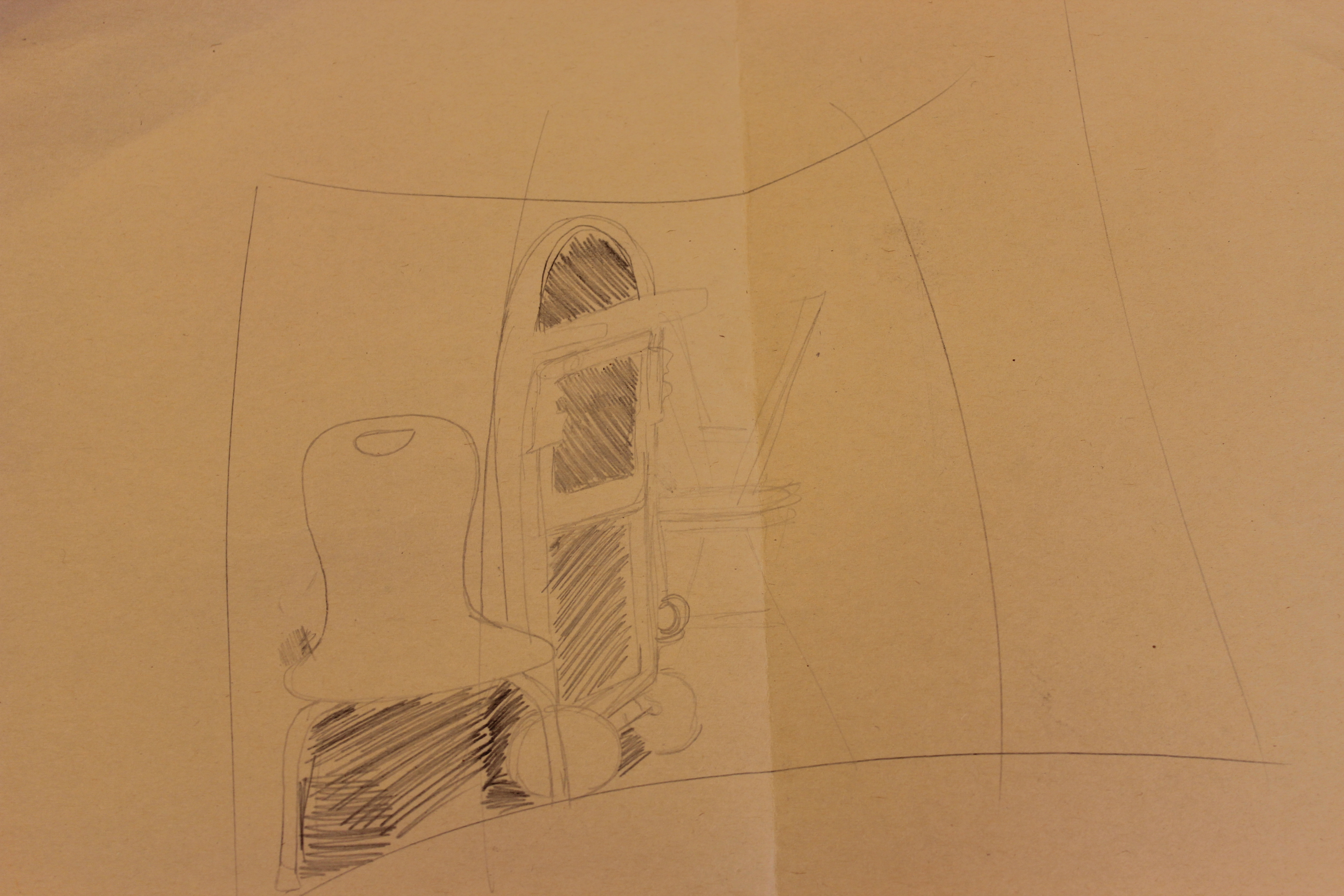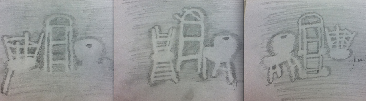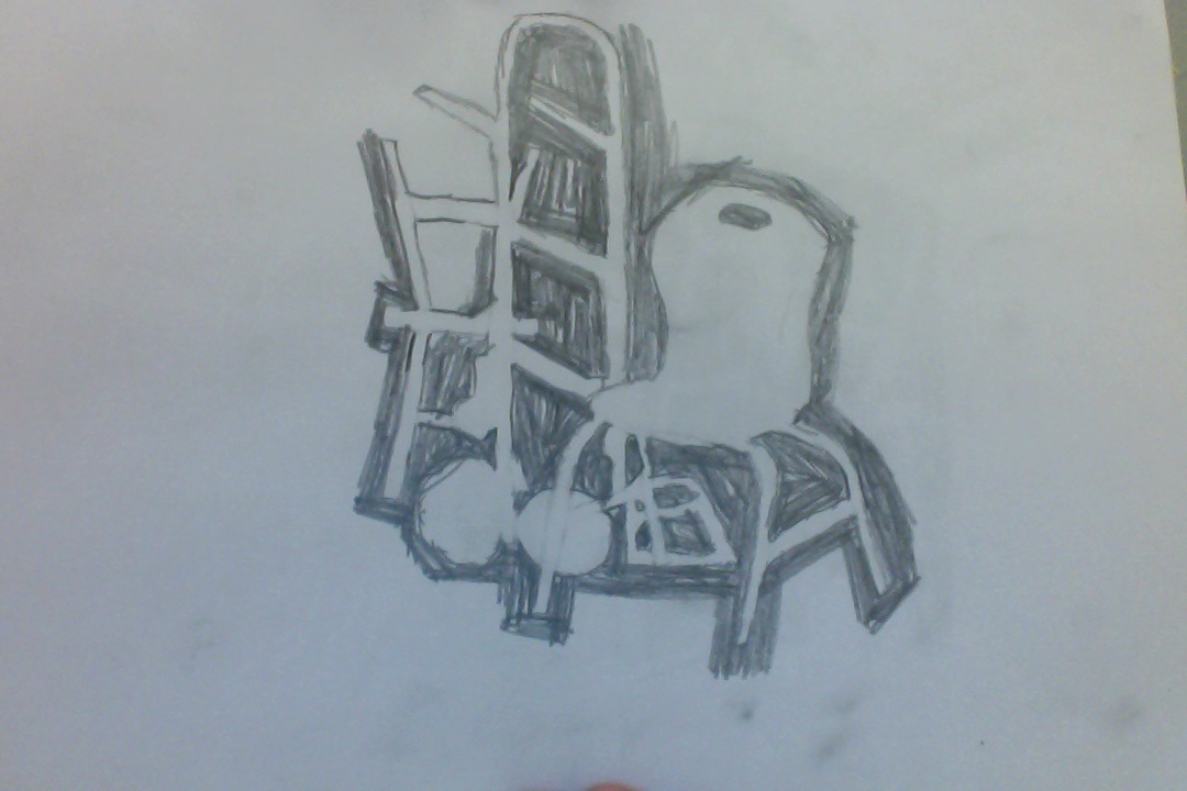 B.1. In my cut out I would cut out the parts with different shadings as the barrier to define where to cut then since the picture was symmetrical. I placed it so that I used every other piece on one side of the paper. 2. For the still life drawing I drew the chair, shaded around it, and then erased the straight lines so it looked like I just shaded it.