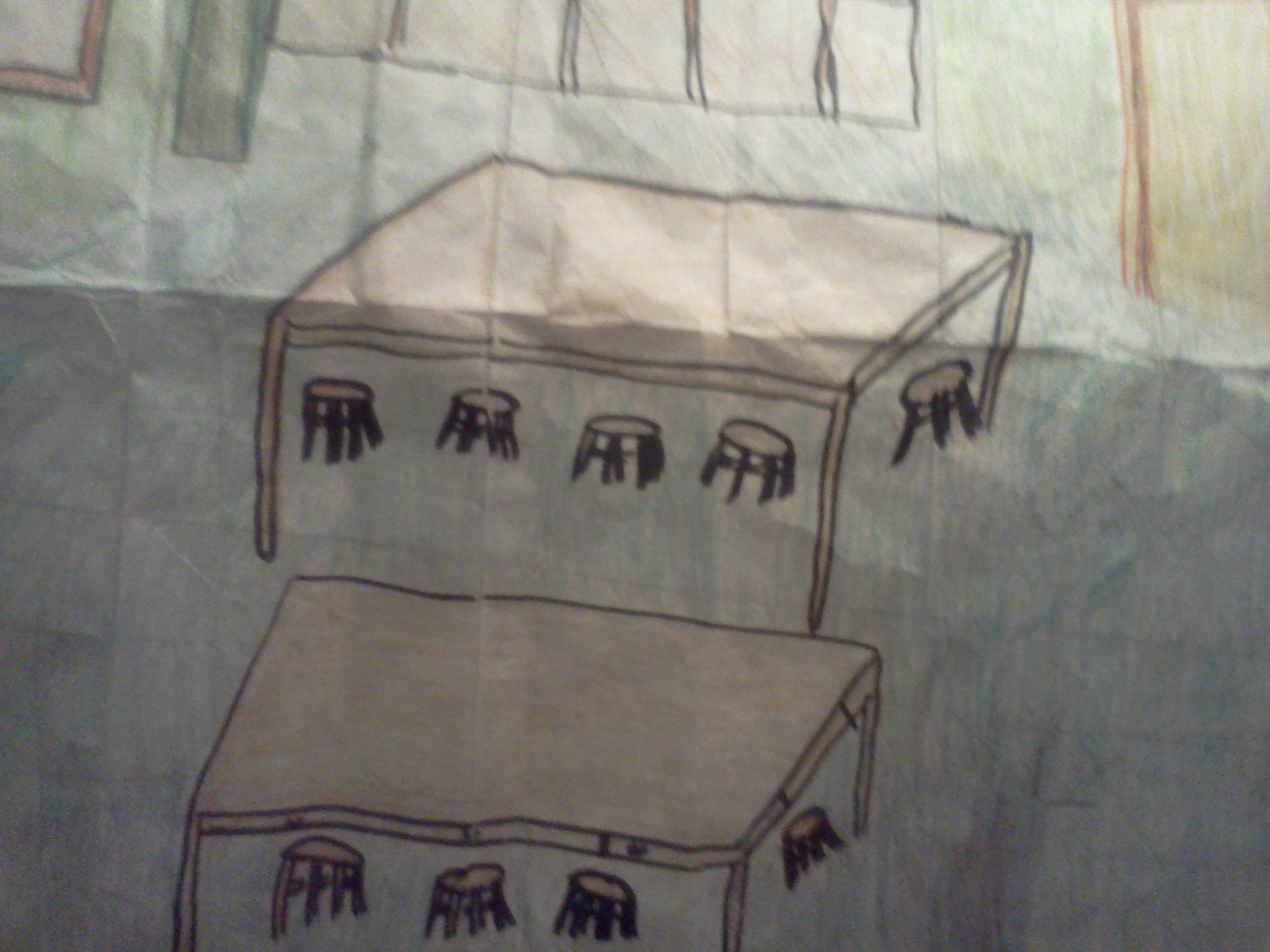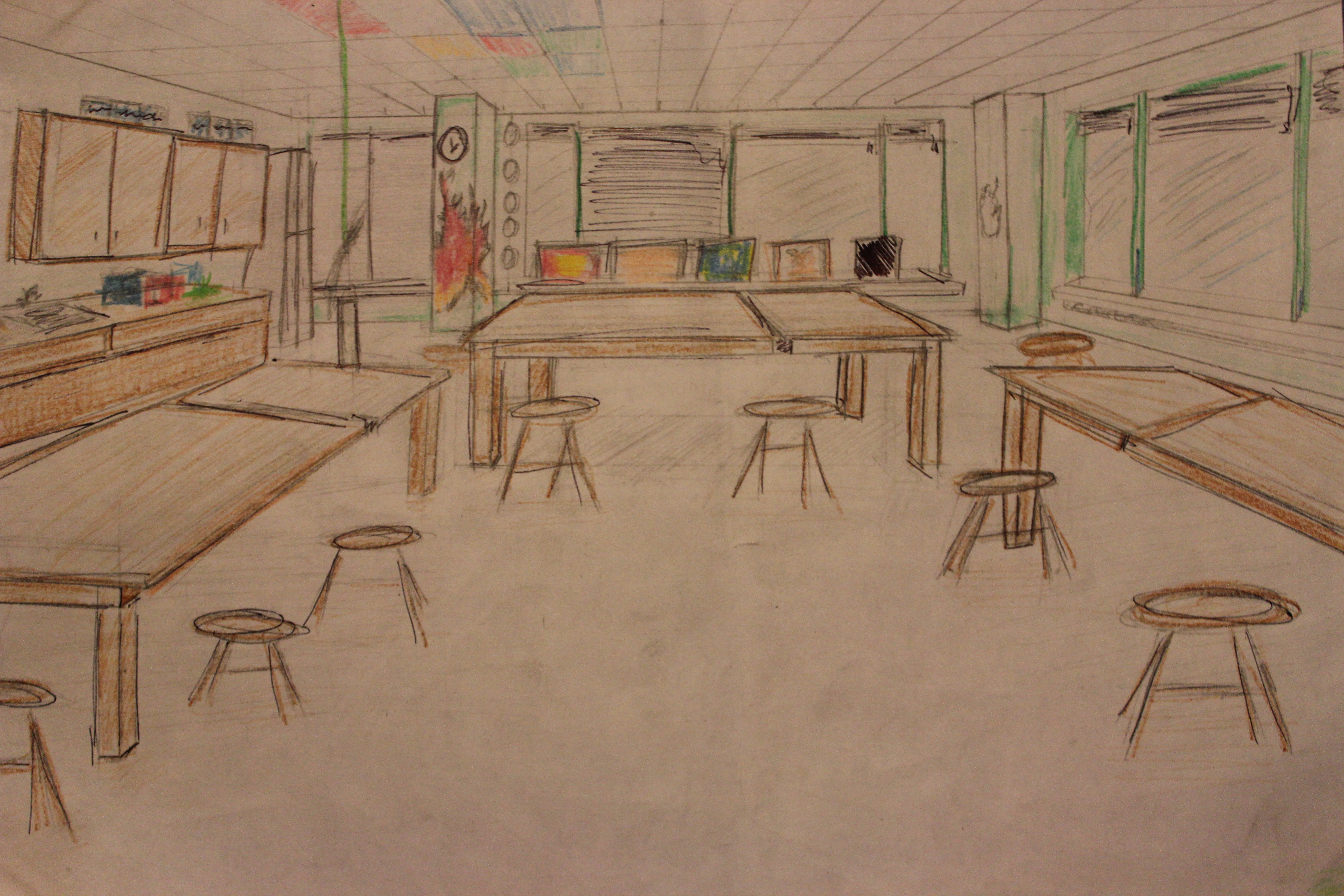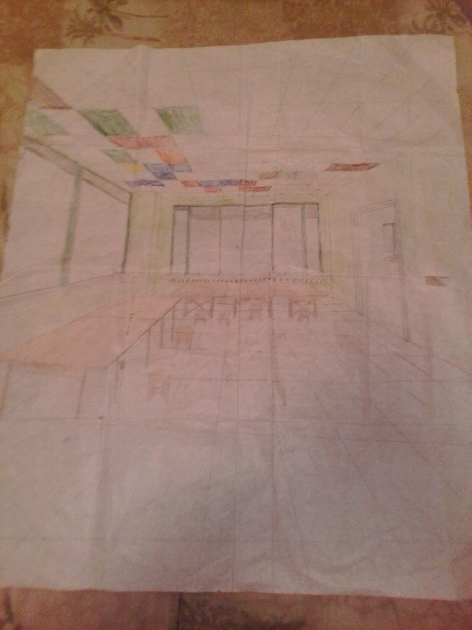 I think if I did the assignment again, I would definitely take more time to finish the actual drawing before doing all the details. I started drawing everything on the ceiling tiles before I finished drawing everything else, and it made it hard to finish at the end because I was running out of time. I would definitely need to use my time better, because it was really stressful at the end, especially because I had to color in the entire picture at the end. Coloring my drawings is usually not my style, so I just added a few bursts of color in certain areas such as the tables, stools and wall. I also added a small amount of color in certain ceiling tiles. I was actually pretty proud of the outcome.