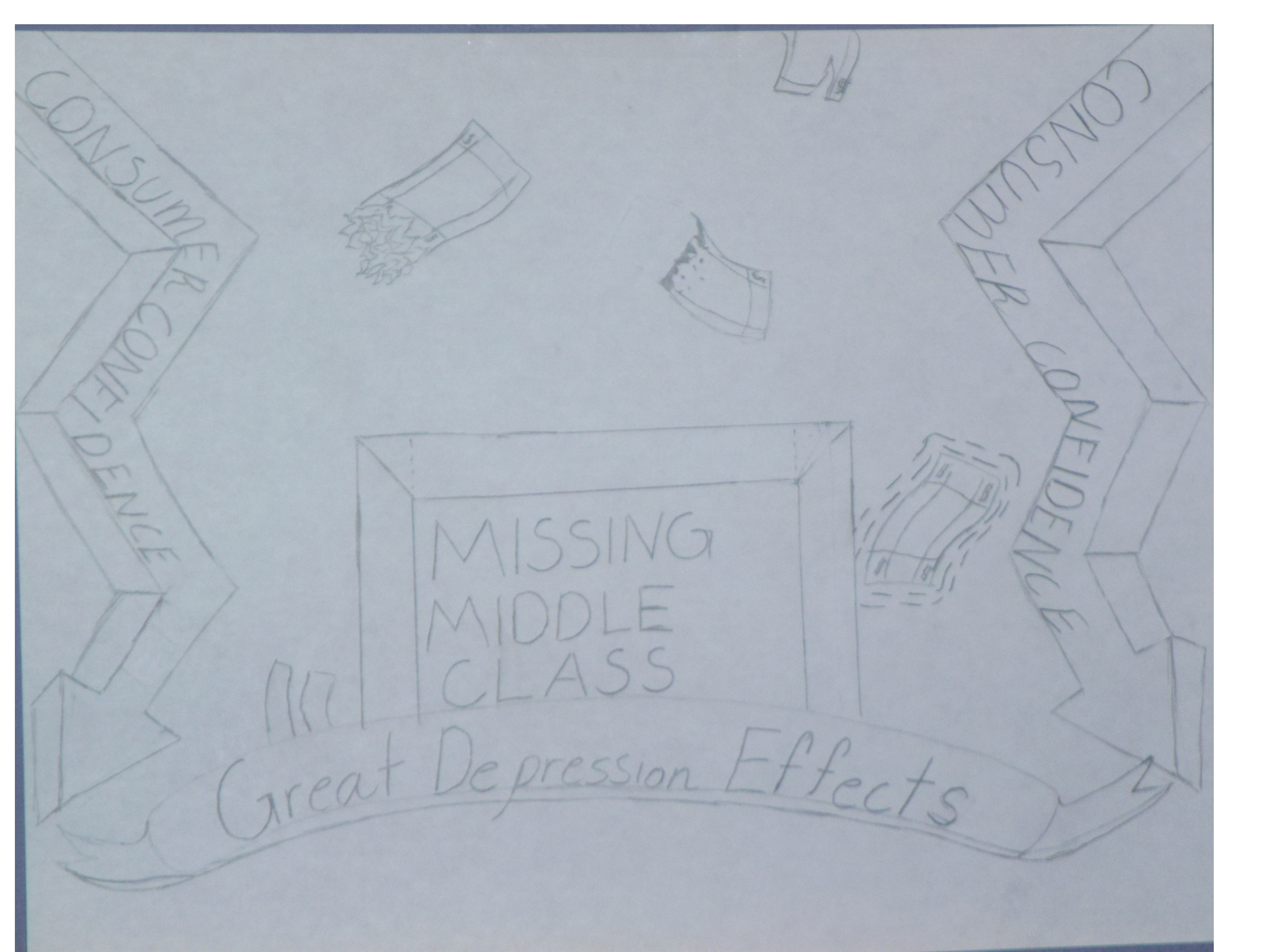 In this picture: All three of those major events were represented. You can see empty bank vaults, A giant bowl of dust, and a stock market crumbling.