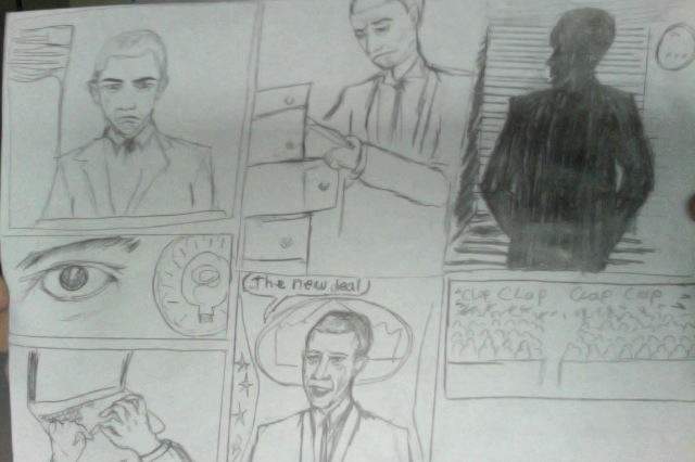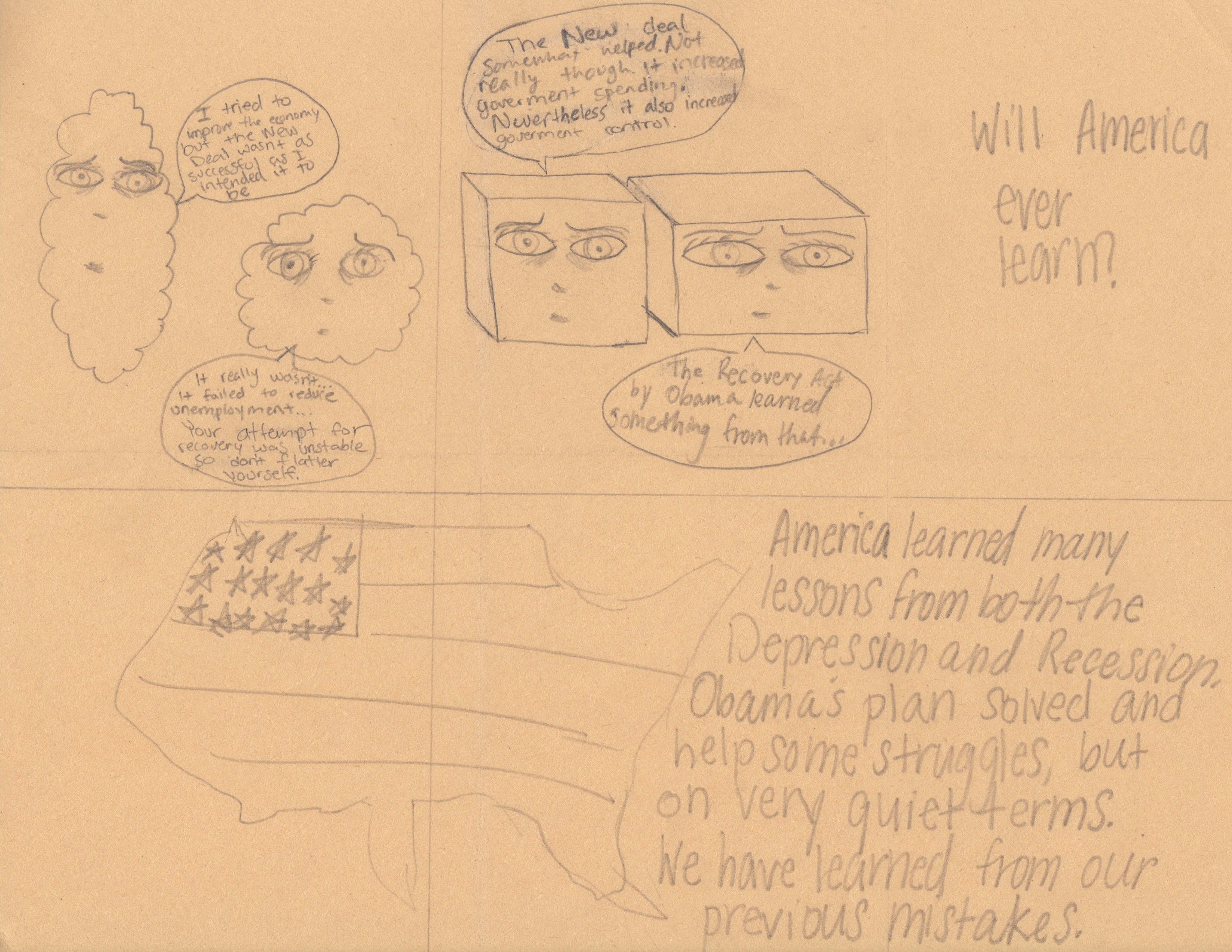 In the introduction page, there are two boxes; one representing the Great Depression and another representing the Great Recession. There are also two clouds representing the two presidents. The sole reason why Roosevelt and Hoover are two clouds is because both are from the past, intended to look eerie and cloudy since they are no longer current. The comic is set up so that one can differentiate between each cloud and box because one will always be greater than the other. For instance, The Great Depression was greater than the Great Recession, therefore it is a rectangle withholding greater volume than the Great Recession’s cartoon representative. Furthermore, as Hoover was greater in size than Roosevelt, one can assume that their ghosts would reflect this size difference. That is how the two cloud cartoons are set up to be differentiated. Overall, this cartoon is meant to entertain and inform a young audience about all the factors that play into the Great Depression and the Great recession.