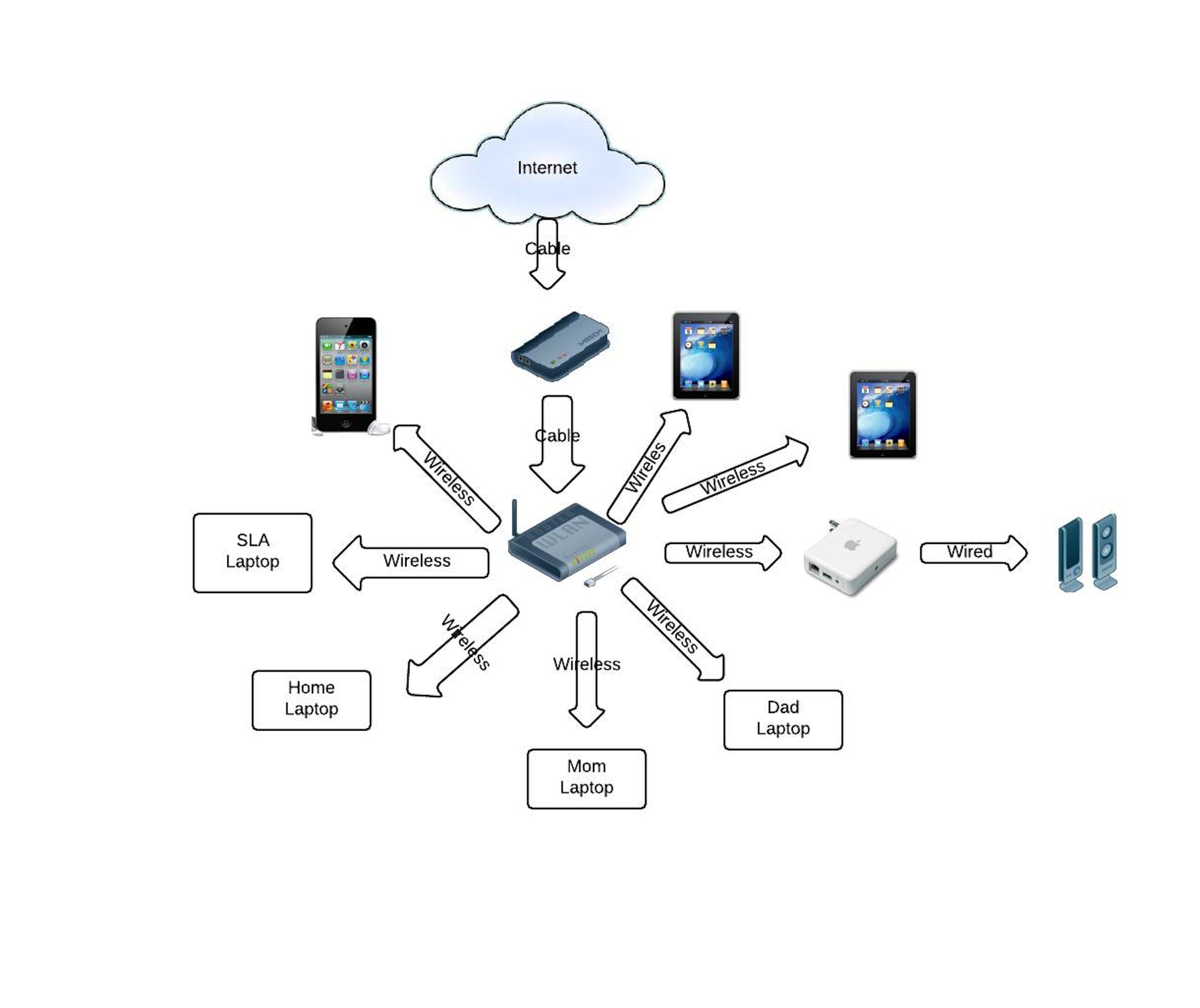 - On my home network is my iPod, my phone, my laptop, my dad's phone, iPad and laptop, my mom's phone iPad and laptop, our phone service, our TV, and our Wii.