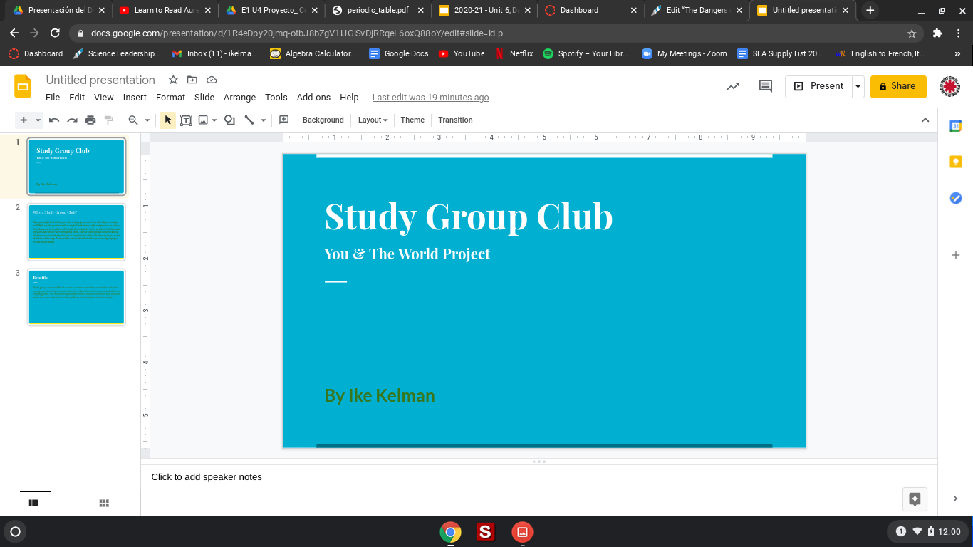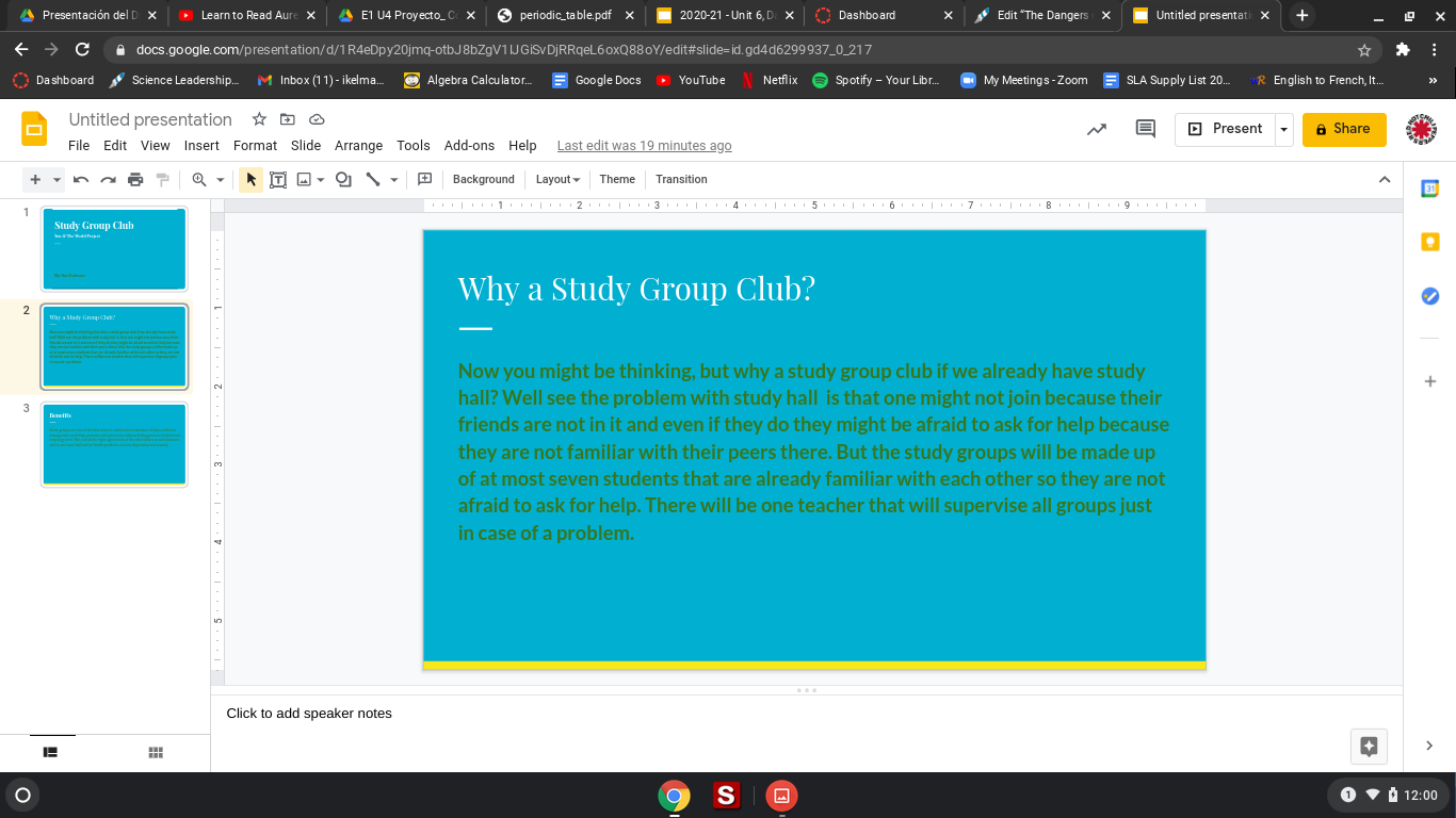In my latest slate post I talked about the threats that come from homework and how to manage it, but most recently I’ve been trying to start up study groups to help manage people’s stress. These study groups will be in groups of seven students that are already familiar with each other so they are not afraid to ask for help which has been a problem in the past. So this will help encourage students to ask for assistance as this is one good way to eliminate stress. It will also help with time management which is also another tool to fight stress, especially if it’s long term. As you will need to meet once, maybe even two times a week for an hour to study for a test or help one of your peers with their homework. I chose to do my You & The World Project on the stress of homework because it’s something I have experienced in the past, as of many others as well. It’s also a really untalked about subject it’s often overshadowed by many other serious problems. Probably because most don’t know the dangers of it, as I myself didn’t know what it could do until I did research on it. It can cause various mental health problems like, anxiety, and depppresion. It’s one of the silent killers, so I brought more attention to it and came up with a way to combat it, the study group. Which has seemed to work so far for me, as I have studied with my friends to help test it, and was proven successful. I will likely pitch my idea to the princable, hoping to form this club. I will be have using a google slide show to help sponsor idea. I feel like this project has a lot of value that just hasn’t been uncovered yet, as it can benefit many people, not just myself and the students. But the teachers and the families of stressed young ones, as it can bring down many people. I wish for this to be in person as it would be much easier to orchestrate, as of right now I’m online and it is hard to start a club that it primarily done face to face. I hope this club will last once I have graduated from high school so it can help future students, benefiting all and I hope this will inspire other students to bring awareness to this subject and hopefully it can get talked about at other schools as well as community centers. This will be one way to help defeat not just anxiety but stress as a whole.
