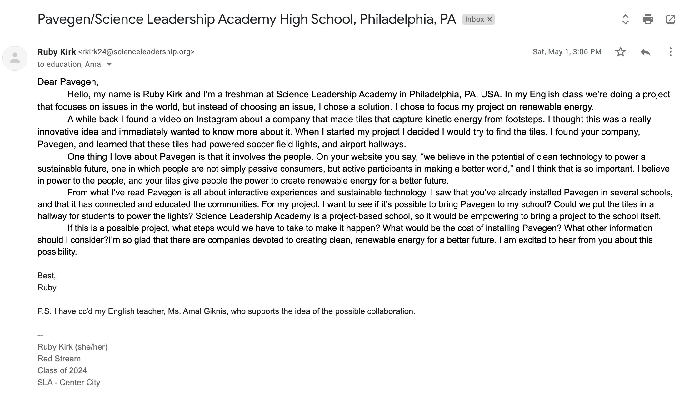 I first looked at Pavegen’s website more, and saw that they have a section for education specifically. They have put these tiles in some schools already, and have an email specifically for education enquiries. So I decided to email Pavegen about my project.