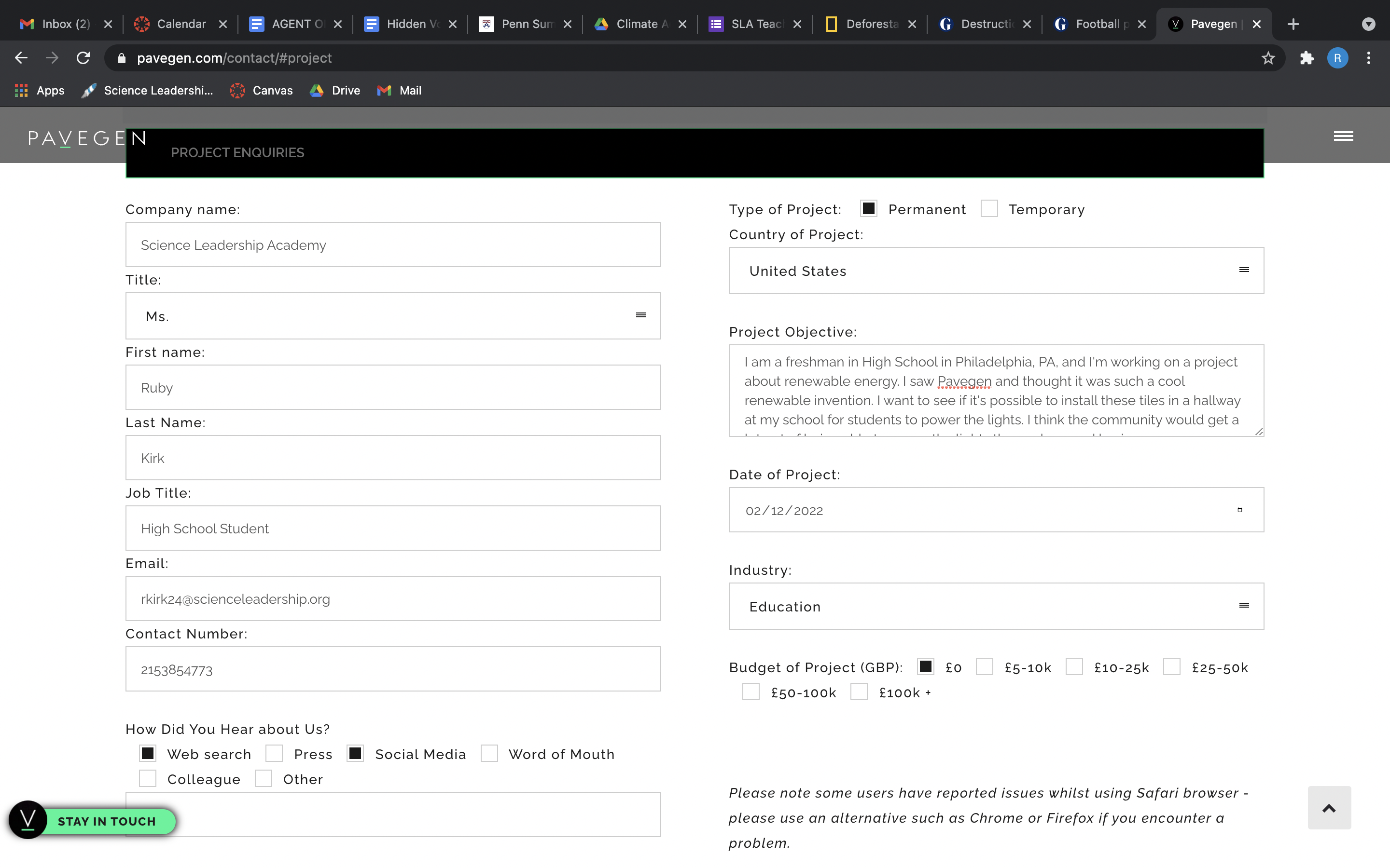 I didn’t get a response, and later saw that an automatic one had gone to my spam telling me to fill out a project enquiry on their website. So, I went to the site and filled out the enquiry. I set up a meeting with Mr. Kamal to talk about what he thought about the project as the Engineering teacher. He told me about corporate sponsors and how they could help if we had to fund the project. He helped me fill out the project inquiry, and I submitted it.