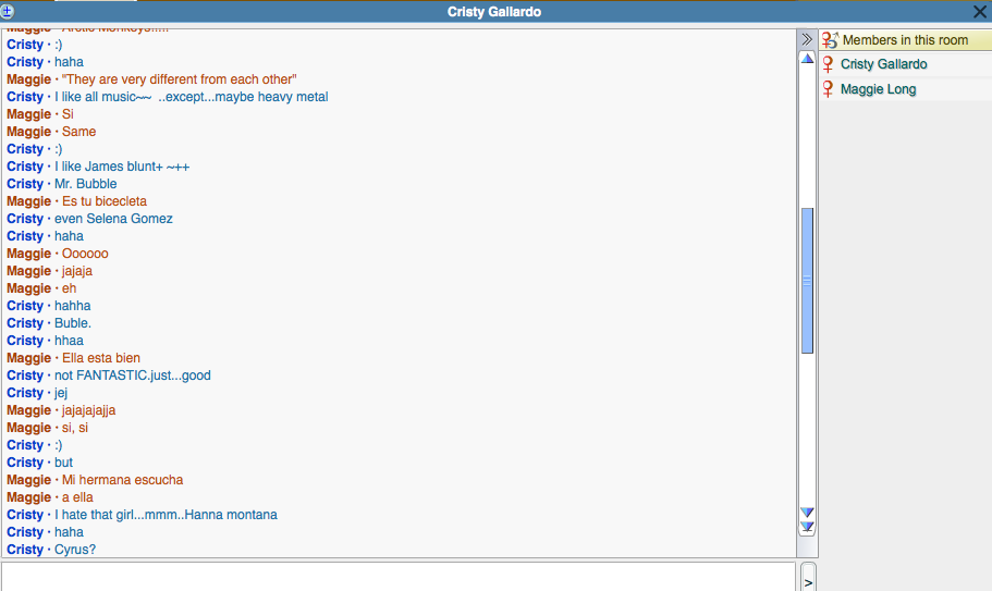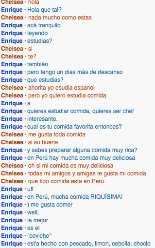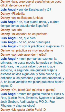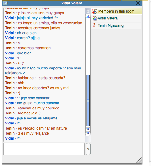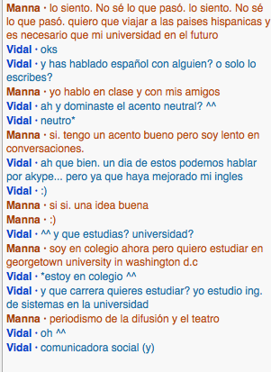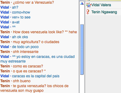 I spoke to Elizabeth from Venezuela and I picked her because like I said in class back then, I am more comfortable to speak to girls than speaking to guys. I also like her because she's nice and we're both learning how to speak different language. Me spanish, and her english. Our conversation was pretty brief because she said that she have to help her mom on something. She's pretty proficient in English already so she pretty much helped me the whole time.