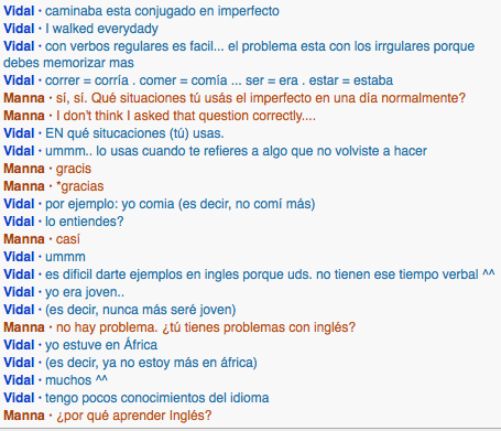 My goal was to find examples of when the subjunctive and imperfect tenses are used in everyday conversation. This conversation was some what helpful in meeting that goal. Vidal had some difficulty thinking of specific examples, but was able to give me a few that helped me get the general idea.
