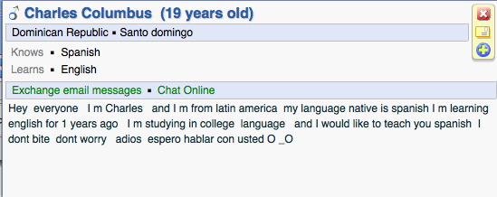 Honestly, I didn't gain much from this conversation except morale. Before this I'd had many dud conversations but this was uplifting. I didn't learn much because he chose to write in english, while I wrote in spanish. In the end, it worked out because I could tell if he understood what I was writing by his responses and it was much easier to do in english.
