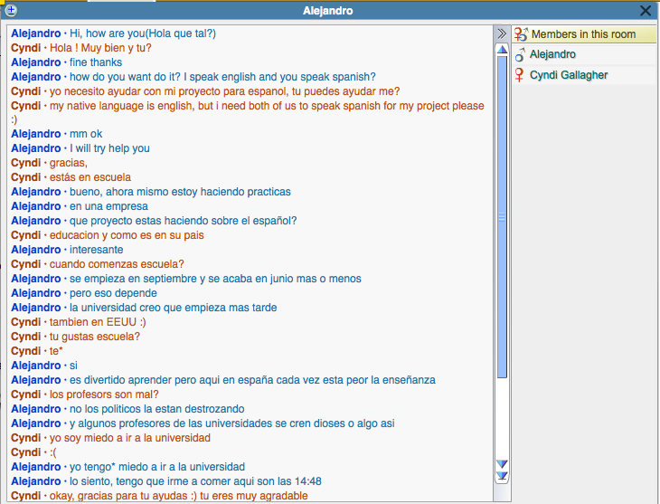 This interaction helped me because I learned a lot more about Spanish culture. I also wanted to know about the daily life of a person who lives in another country.What specifically did you do well according to your goals/expectations?