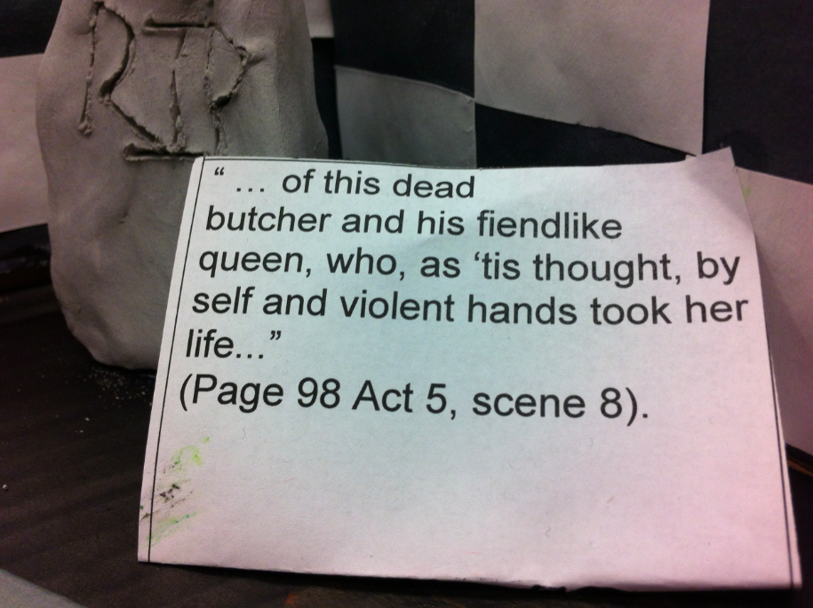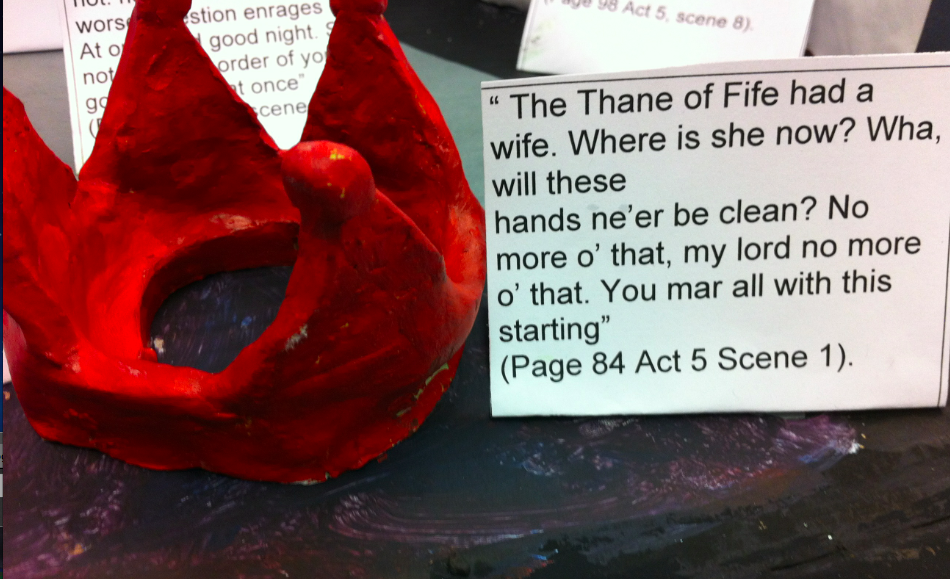 The artwork is based on Lady Macbeth. The sculpting is symbolizing Lady Macbeth’s important key in the book. The first sculpting is about power because at the beginning of the book, she became really obnoxious with the power. She wanted to take over the control and guided her husband, Macbeth to be the king. The next following sculpting is a knife. It shows that Lady Macbeth encourage Macbeth to kill King Duncan so both of them can get the power. There are quotes when she had talked about the dagger. The third sculpting is a crown. Lady Macbeth had the wish to take the crown as a queen to rule the power with her husband. This shows that the power had symbolized lunatic because she was scared that nobles would find out later. The power was too much for her where she had committed suicide. She didn’t really care about living than suffer in pain of killing. So the sculpting shows a memorial grave for Lady Macbeth’s death.