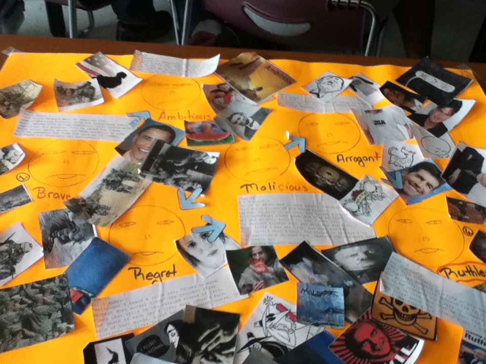 Macbeth has been on a journey. A journey full of lies/deceit, blood, and greed. In the picture that I drew I wanted to show Macbeth’s path in one 2-face picture. Macbeth has gone from a noble man to a tyrant. I wanted to portray that in the drawing. I’m going to start with the right side (or left, from your view). This is Macbeth’s human face, I made him bald because that’s how he looked like in the movie and I thought it was better than what I was going to draw. This side of the face shows his valor, bravery, and honesty. It shows a soldier worthy to fight for his country and will stop at nothing for justice. The skull side has the crown because he turned evil and something so dead after he became king. The blood in his mouth is to show how bloodthirsty he was in order to protect his golden power. The eye socket shows how hollow and lifeless he has gotten and the cracks represent him wearing down to his final fall, the blue paper represents Macbeth’s lost soul hidden away and gone forever.