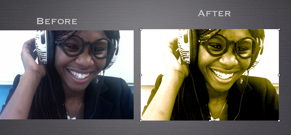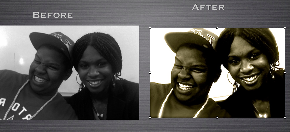 Ms. Hull told us to take 200 photos of everything and anything we wanted. I focused my theme on my friends, and my self. I had fun taking photos, and I specifically tried to be as creative as possible. The reason for taking 200 photos is to edit 5 photos, and publish them. I was nervous because I don't know how to work photo shop. But after Ms. Hull taught the class I became expert. So I took five of my favorite photos and edited. I had one photos and cropped and added a colorful back ground. Most of the other photos i changed the tint, blurred edges, black and white, and other things.Mi Reflxión