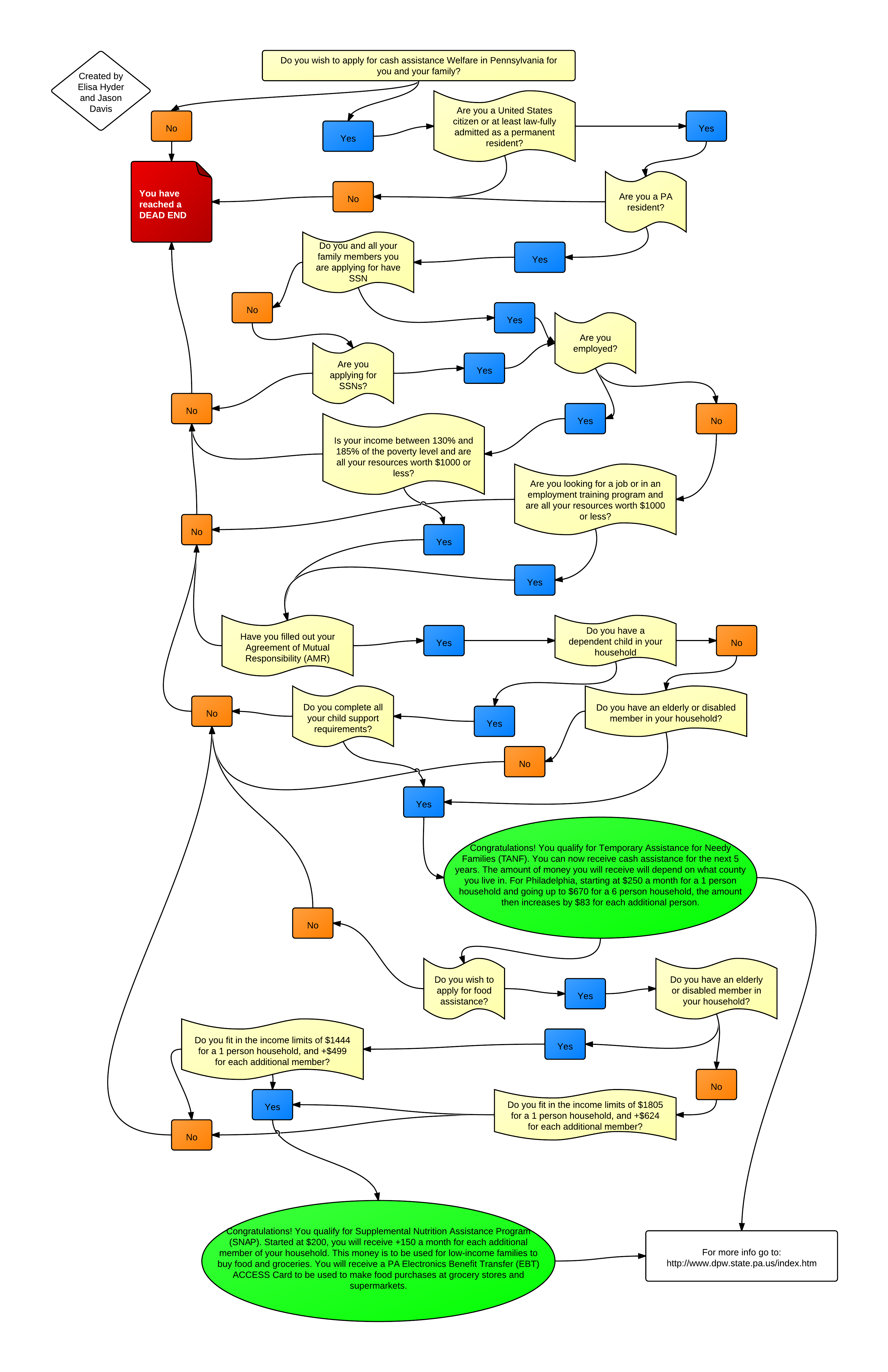 Jason Davis and I decided to take on the task of filing for welfare, specifically cash and food assistance. In order to qualify for either of these, everyone in the household must be a citizen or at least allowed in the country as a permanent resident and have a social security number. Also, you need to show that you are either employed or are trying to be employed. Then, it all comes down to how much assistance you qualify for, which depends on your total income and how many dependents and disables are in the household. Welfare is only a temporary assistance, and before you are given any assistance you must fill out paperwork showing that you will work towards sustaining yourself after the welfare has run out. When trying to go through this task of learning about the process and making the flowchart, Jason and I focused on the paperwork at first. As soon as we realized that the paperwork doesn't actually explain anything clearly, I went digging into the website for Pennsylvania welfare and benefits. I found lists of the qualifications of the different types of welfare, and I went about connecting them. So, we finalized the flowchart and just finished up the paperwork.