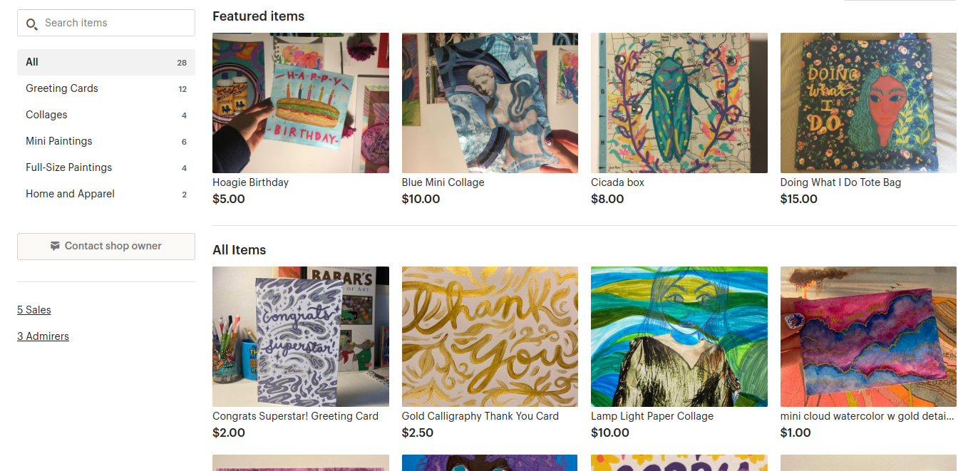 For my capstone, I created and ran an Etsy shop where I sold my original artwork. I sold greeting cards, watercolor paintings, collages, and different customized items that I painted/collaged on such as tote bags or jewelry boxes. All the proceeds from the sales I made went to Philadelphia’s Mural Arts Program, an organization I am passionate about. When my capstone was finished, I was able to raise over 400$.