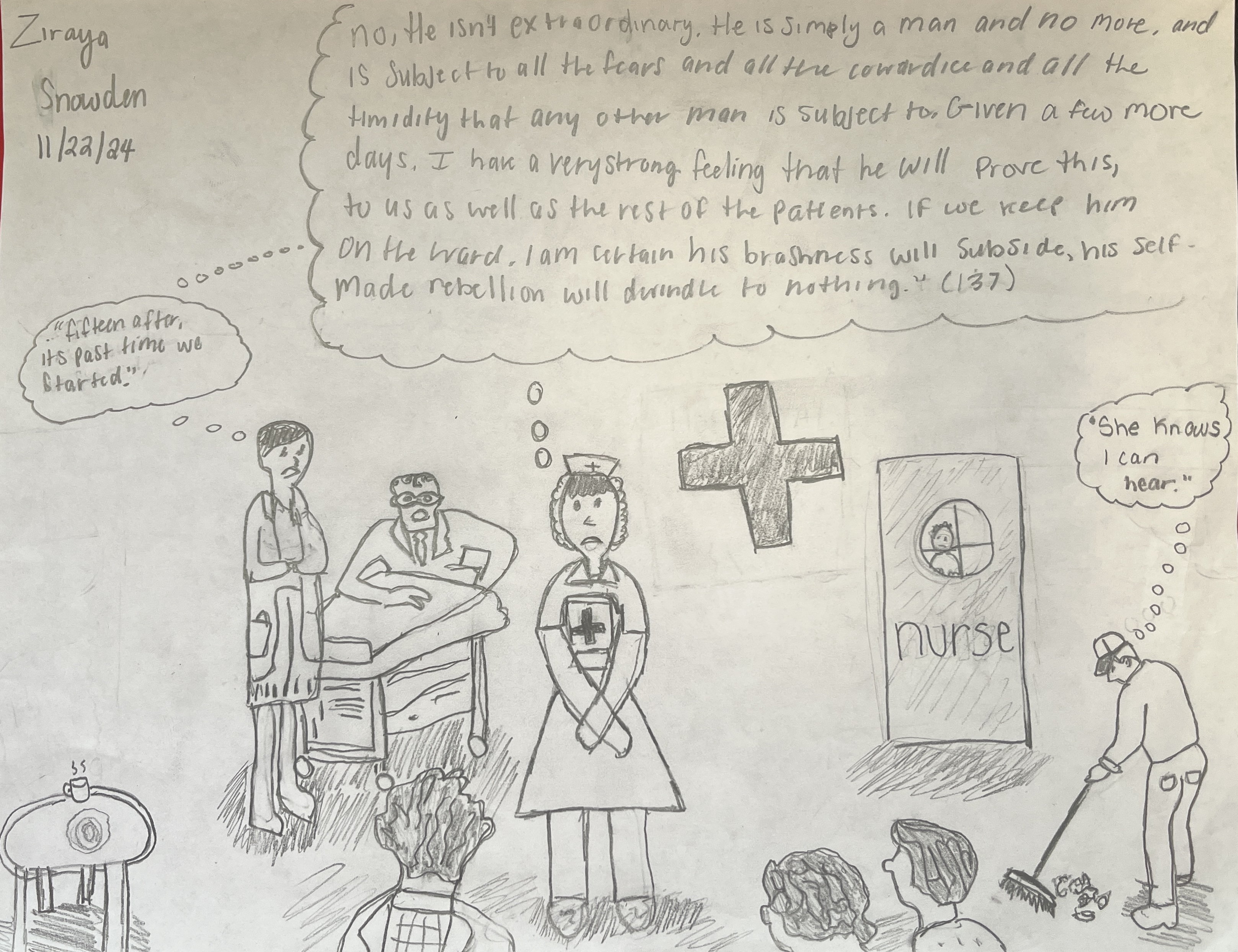 I wrote this scene from the perspective of Mcmurphy. I decided to write in a lot of short snappy sentences with casual and not very descriptive narration. He speaks in a colloquial way in comparison to the way Bromden narrates and Nurse Ratched speaks. He also curses a lot and is often exasperated which I express through his narration. He’s also very manipulative so I made it clear through his thoughts that he’s strategizing how to get everyone to cooperate with what he wants. He objectifies and flirts with Nurse Ratched a lot so I also included that in his thoughts.