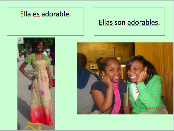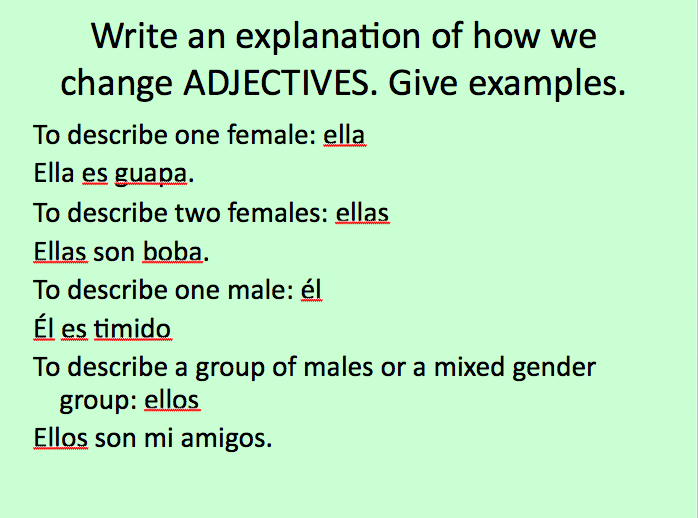 Adjective agreement Posted by Jessica Maiorano in Spanish 1 - Manuel on Friday, December 3, 2010 at 9:00 am Screen shot 2010-12-03 at 9.57.16 PMScreen shot 2010-12-03 at 9.57.37 PMScreen shot 2010-12-03 at 9.57.46 PMScreen shot 2010-12-03 at 9.57.56 PMScreen shot 2010-12-03 at 9.57.01 PMScreen shot 2010-12-03 at 10.02.41 PM