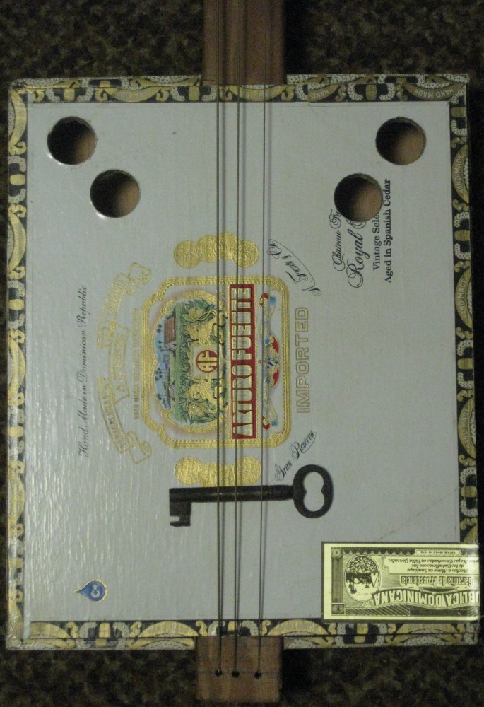 three stringed guitar out of a cigar box, a piece of wood, and some odds and