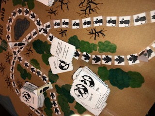 The game is played on a game board that represents a trail to a better destination. In order to travel, you will have to roll a die. Along the trail are symbols relating to four different types of cards. If you land on one of these symbols you have to pull a card pertaining to that symbol. The four types of cards are risk, reward, health and morality. A risk card will have a negative impact on your player (i.e., your player enters an empty house however in search of food, however they get hurt instead). A reward card will have a positive impact on your player. (i.e., your player finds multiple canned foods that are still good quality). A health card will affect your player’s physical and/or mental health (i.e., your player gets sick and their health goes down). A morality card will present you with a decision that will have a negative or positive impact depending on what you choose. This can increase or decrease your morality but benefit you in the game overall. You can keep track of these statistics by using a tally system on the note cards provided. Your main goal is to get to the end of the board first. If you do, the value system won’t apply to you.