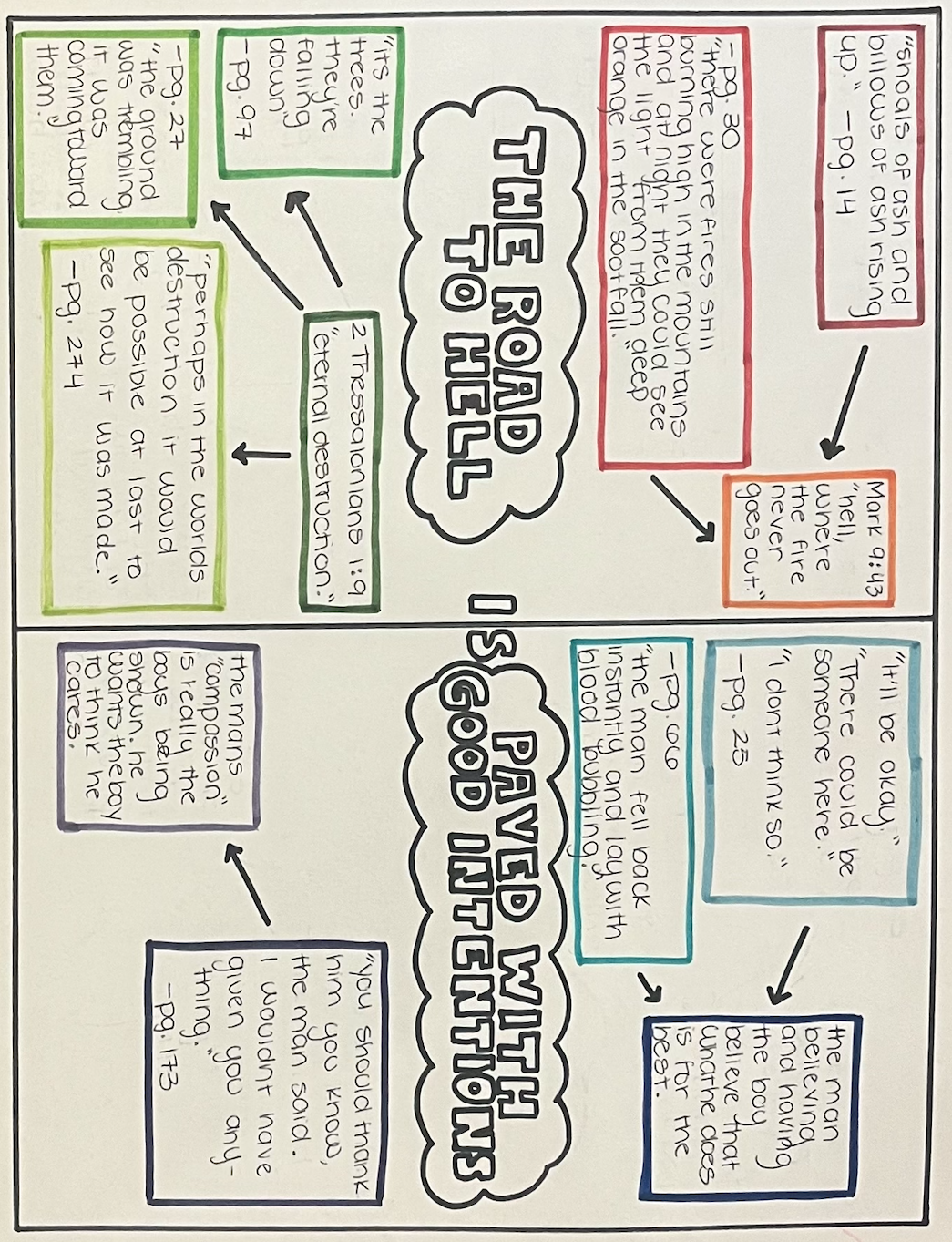 The novel, “The Road” by Cormac McCarthy; is a story of a father and son navigating through this post-apocalyptic world having solely one another. The constant danger of the unknown causes the father to keep moving, not allowing them to stay in one place for too long. Despite the boy constantly asking to enjoy the few blessings they had come across, the father was constantly quick to say, “We can’t stay, he said… It’s not safe… We have to keep moving.” (McCarthy 42). This repetition of this phrase occurs multiple times throughout the novel. The sensation the reader gets while reading these phrases is that it is always rushed. Each drawing around the road represents an event that occurs in the novel and leads the man to tell the boy to “keep going” and go back on the road. The road is the only consistent element throughout the novel. The man is continuously rushing the boy to go back on the road. His constant fear of the unknown pushes them to continue their journey on the road. That is also why we chose to draw the road in a circle-like shape, to represent the cycle of the man and boy going back on the road. This cycle of pushing forward despite knowing the ignorance of youth is being stolen from the boy each day, hoping to see him grow and carry on the fire. Striving to keep a good moral compass in a world where morality is thrown out the window and dehumanization is the new norm.