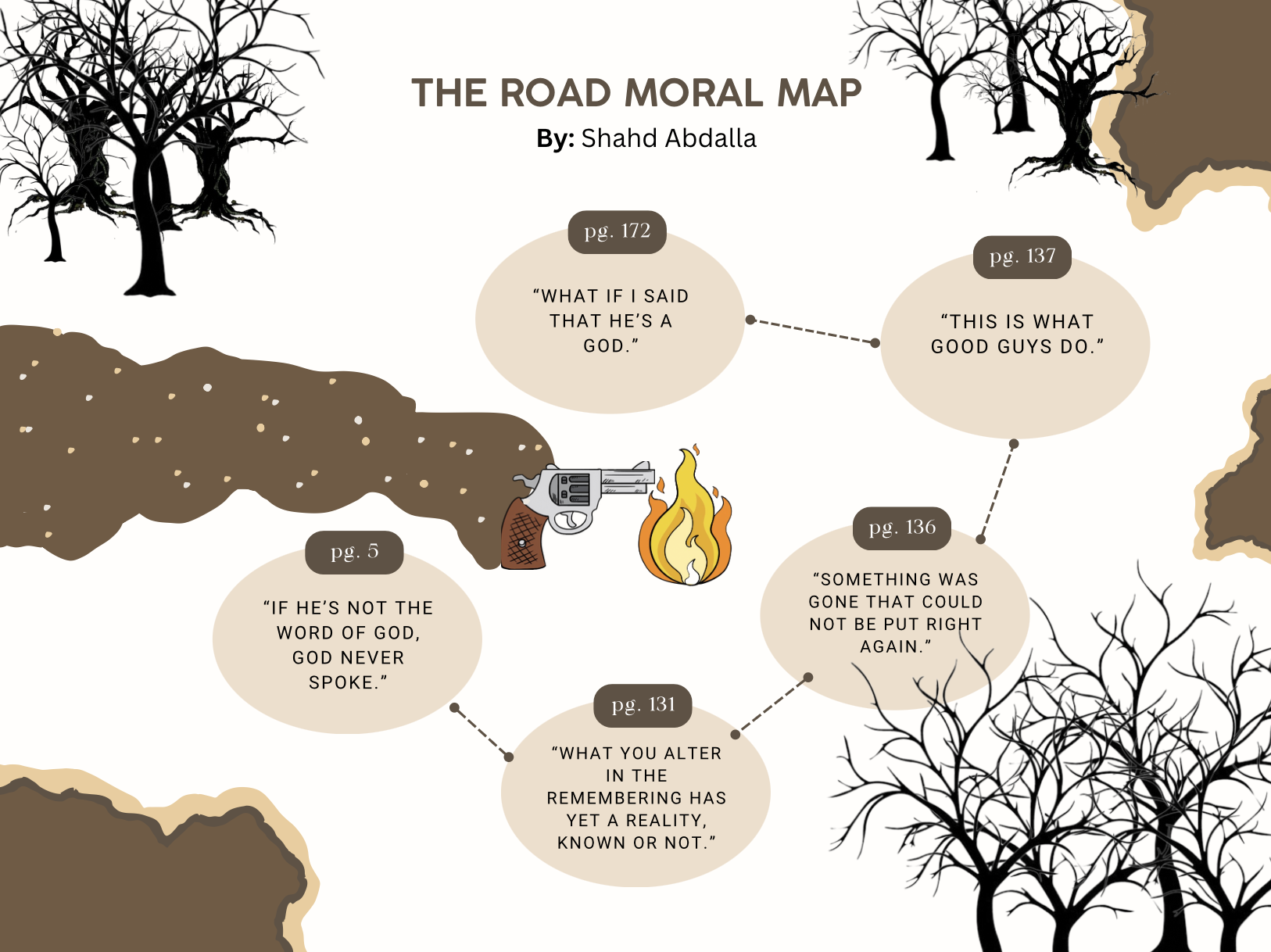 Throughout their journey, the father had been sick. He was constantly coughing and taking breaks to catch his breath, and eventually, it came to a head. The father knew he was dying, and the son didn’t know what to do. He was overwhelmed with emotions, and couldn’t imagine his dad leaving him. “He slept close to his father that night and held him but when he woke up in the morning his father was cold and stiff.” (pg. 281) The son stayed by his father for days but finally decided to venture up the road. He ran into a man on the road and when they went back to where his father laid to rest, the man from the road told the boy he needed to keep moving. The son wanted to bring his father with him, but the man told him how unrealistic that was. He said his final goodbyes and off he went.