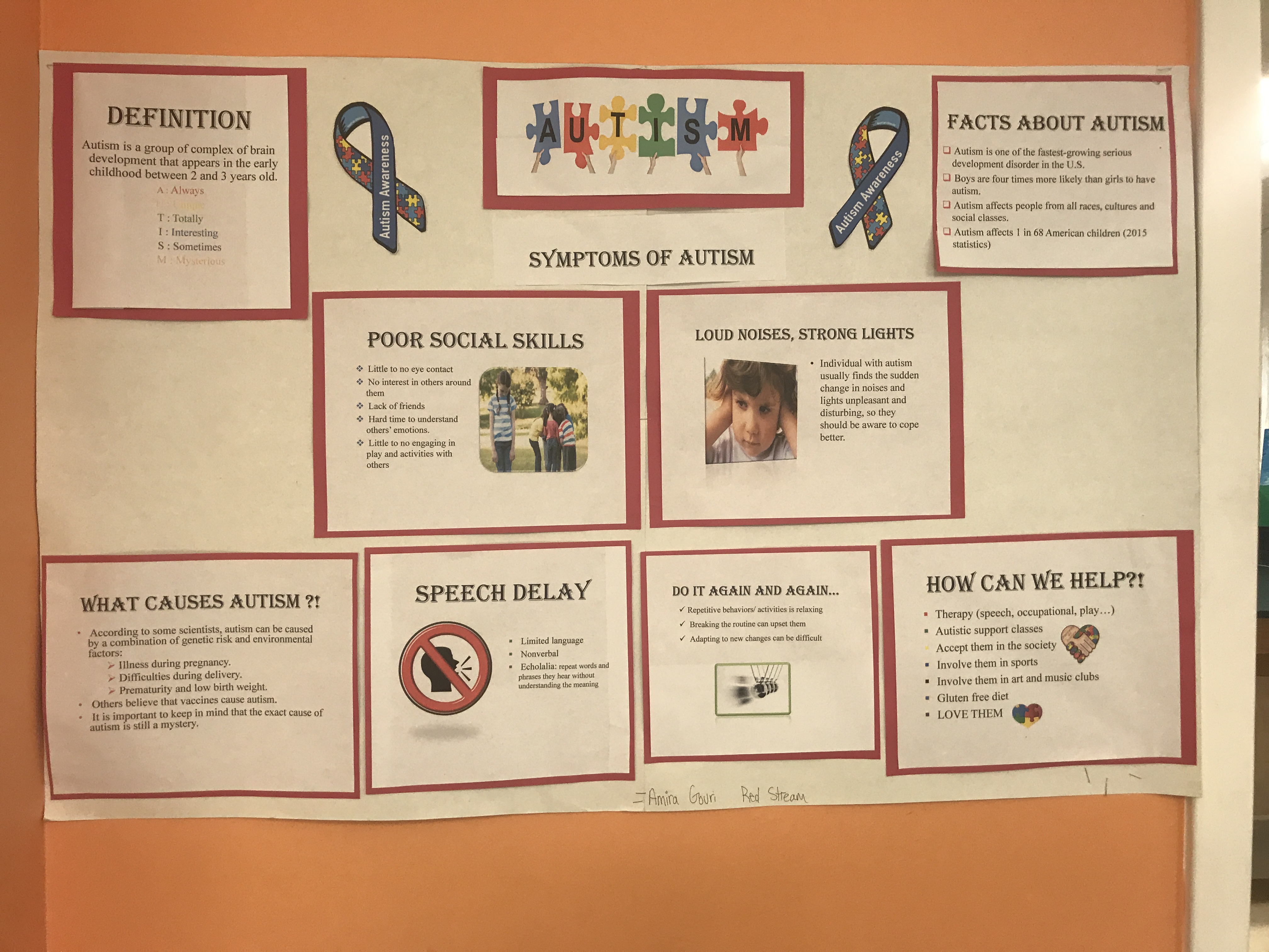 I feel like I should have done more posters, so I can hang them everywhere at school, or make brochures with information about autism and give them to people in and outside the school. I learned many facts about autism that I never knew before, for example I never knew that there is a strong debate about whether vaccines are the cause of autism or not. I also learned that some treatments can be beneficial for some autistic people but not for others. In my opinion, autism is a serious issue that affects innocent children and their families as well, so me and others in the community should spread awareness everywhere, accept these people in our society, ask for their basic rights in autistic support schools and colleges where they can learn, have degrees and have jobs in the future, we should also donate to many non-profit organizations that offer them free activities such as sports, art and music, and most importantly, support their families and offer them help, love and hope.