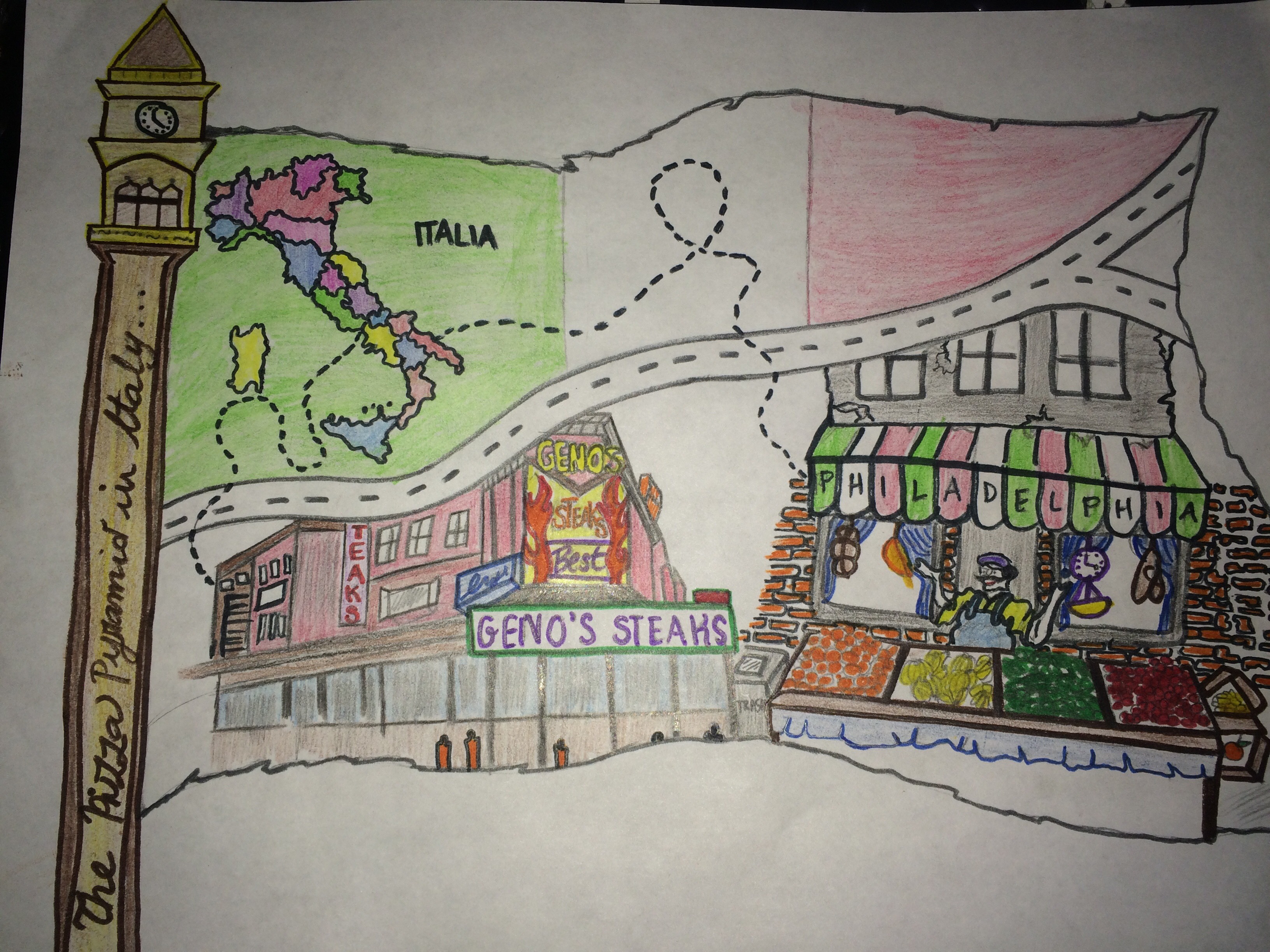 Me siento honrado de haber sido escogido para proporcionar a todos un mural que represente a mi comunidad. El mercado italiano es un lugar muy popular en el Sur de Filadelfia. Vivo en el sur de Filadelfia, y el mercado italiano es una gran parte de mi barrio. Mi padre y mi madre siempre van a la tienda de comida. Lo que más me gusta es la diversidad que hay alrededor de esa área. Muchas razas y culturas están allí.