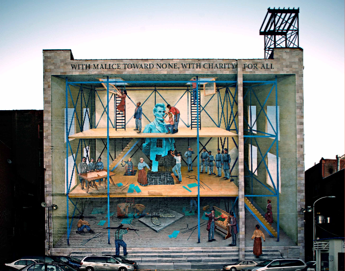 This mural shows the progress of equality in our nation over the years with slavery through the images of the different stages it took. YOu can spot the different backgrounds on all 3 levels, with the first one from the top being the most calming. The quote on the mural states, “WITH MALICE TOWARDS NONE, WITH CHARITY FOR ALL”