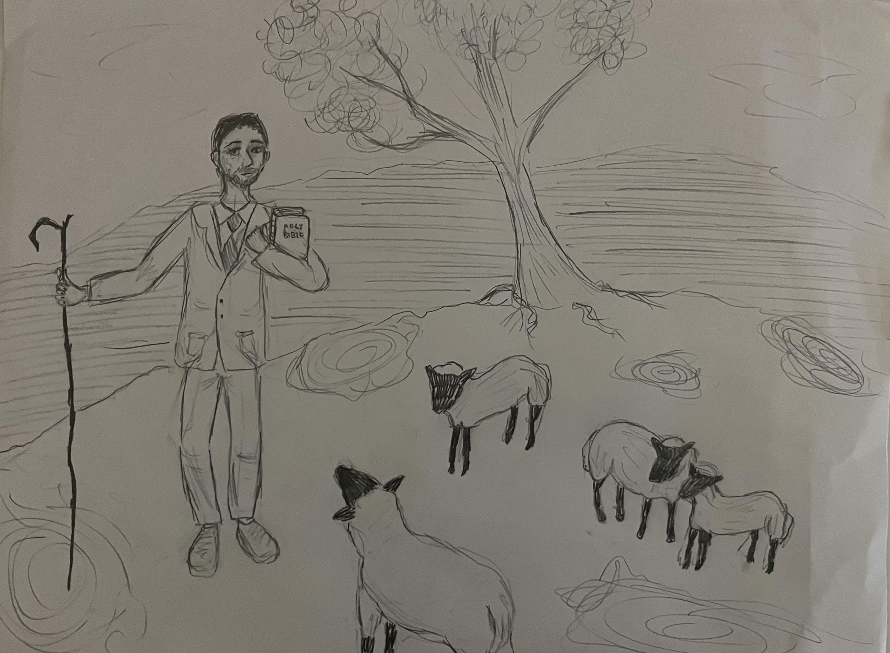 This artwork represents the relationship between the Handmaids and the Commander in The Handmaid’s Tale by Margaret Atwood. Just like with a shepherd and his sheep, the Commander both controls and cares for the Handmaids. Like a shepherd used his sheep for their wool, the Commander uses the Handmaids for their ability to conceive. Shepherds must watch over their herd, like the Commander watches over his Household. Throughout the book, the Handmaid’s are controlled in everything they do, who they can talk to, where they go. Etc. They are simultaneously manipulated, through indoctrination and punishment. In chapter 13, the narrator even compares herself to a farm animal, saying, “I wait, washed, brushed, fed, like a prize pig.” (69) She and her fellow Handmaids are treated like animals, to serve a singular purpose. This idea is significant because Gilead relies so heavily on its power structure to function the way it does. The Handmaids are at the very bottom of the pyramid, while the Commander sits at the top. The Handmaids are powerless, like animals in a farm, and have no choice but to follow the commands they are given. The Handmaids are treated as less than human beings, as simply baby machines.