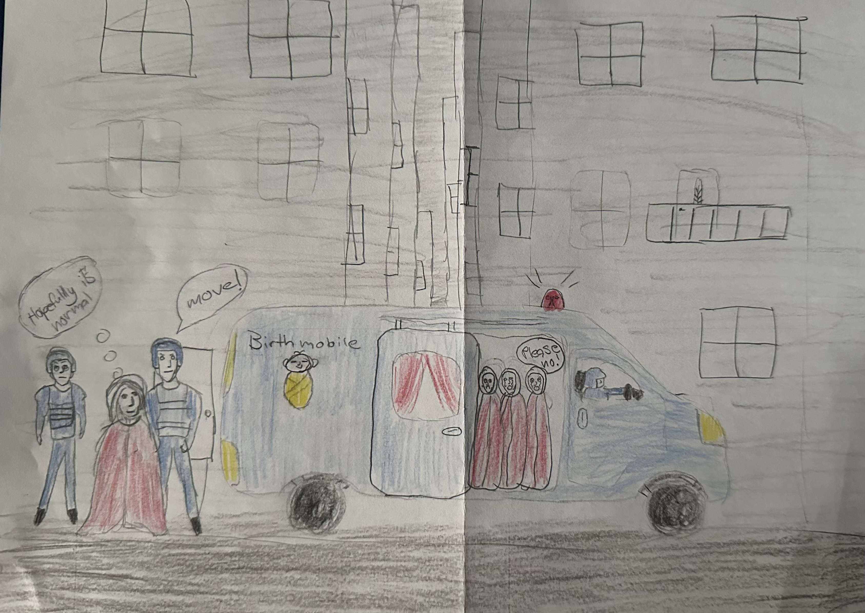 The start of the ceremony, is the day where a child is being brought into the world, the world of Gilead. Ofred wakes ready for the special event and hears the sirens of the birthmobile which sounds like the sirens of something tragic happening like a crime and the police turning their sirens on to alert everyone on the road or the siren of a fire truck; it none of those but a siren of life where a van turns those sirens on to alert everyone that someone is giving birth. As soon as the van gets there, there are guardians standing in front of the van covered in a red carpet with other pregnant women in there waiting. The women there were crying and praying for unknown reasons. But soon enough Ofred finds out it’s because they are hoping their child comes out normal without any problems, such as coming out with missing limbs, having a hole in their organs, etc. Looking at this art piece you get to see the reader’s imagination of how the ceremony went. The first thing that would catch your attention is the van, which in this case is the Birthmobile and the three random women inside of the van. If you look deeply into this photo you can see details described early in the text such as the sirens that sound like one that you would hear during death, for ambulances, or a fire, also you can see the curtains on the windows that were mentioned on the page. 111. Once you look at the Birthmobile the second thing you may notice is Offered in a red cloak like seen in the cover of the book, being led by a guardian. She is getting in the Birthmobile in the driveway outside her home as you can see the tall apartment buildings in the background. The last detail you will see in this art piece is that the women in the Birthmobile don’t look too happy and they look like they are crying, hoping their child will come out normal and that they don’t fall in the 1 ⁄ 4 chance of their child coming out as an unbaby. Also, I made sure to make the background feel cloudy and dark because whenever the story takes place in a dystopia the first thing you think of for its setting is a dark place so I colored the background gray. This scene is Important to the story because this is the next step into Offred’s life and it changes the direction of where the story is going. At first, it was about the society they lived in and how life there is different from the lives we the reader are in. Now it is about Offred and these ceremonies that she is getting into and the relationships they are having with other characters such as the commanders and others: Serena Joy, Moria, Jannie, Aunt Lydia, and more. Even when you go on to the latter pages Offred strengthens her relationship with one of the Commanders, and he even lets her do things that aren’t allowed such as read and look at things like magazines.