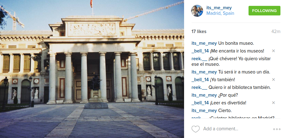 Meymey Seng (its_me_mey) posted pictures of where she visited while in Madrid. She posted pictures of a beach and a museum where her two friends Tyreek Speedwell (reek.__) and Salsabeel Elbakhadaoui (_bell_14) has a conversation.