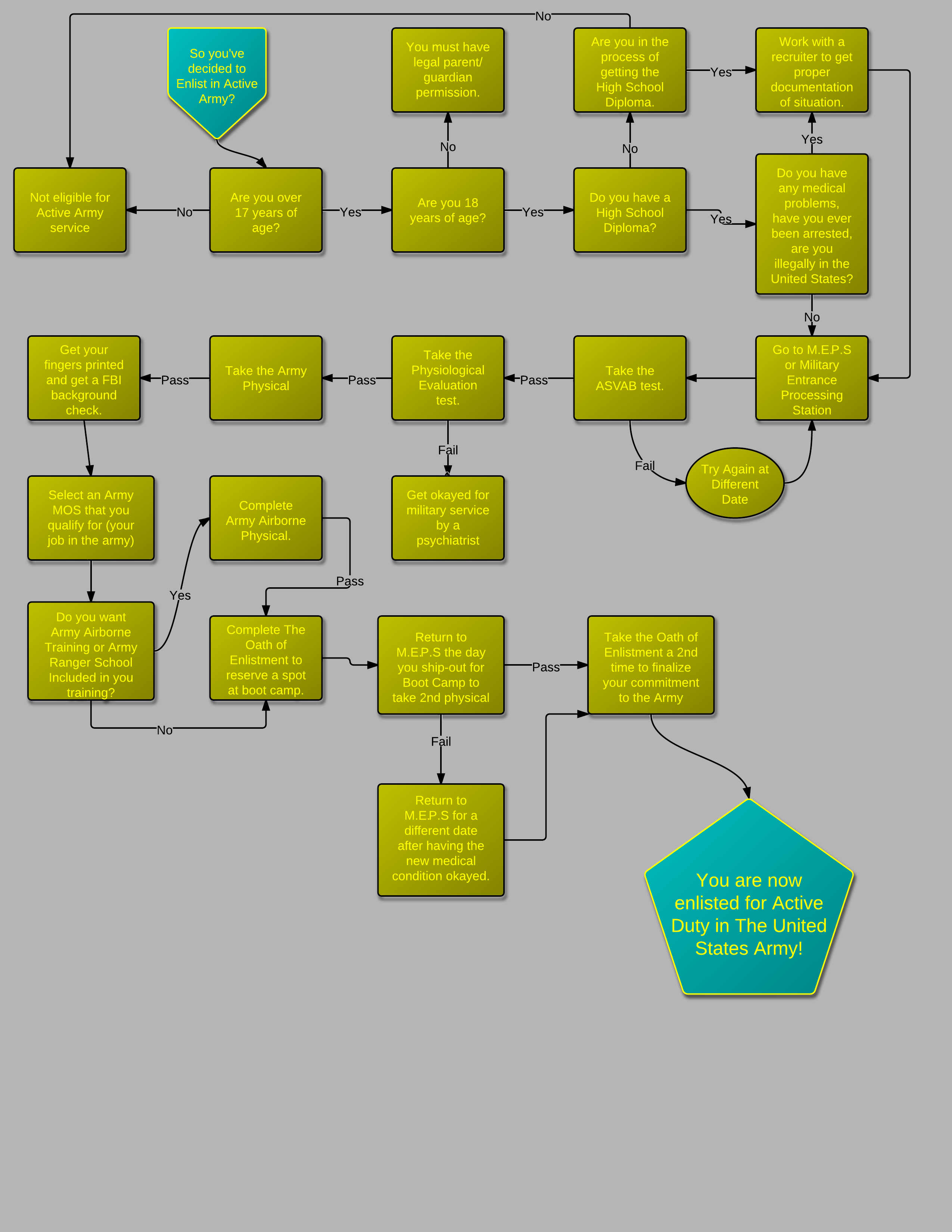 Tim and I decided to create a chart process of Enlisting for Active Army Duty. Of course this is a time consuming process which takes devotion and dedication is you are serious about joining the Army. There are many meetings to go to and test's to take to prove yourself but in the end it's when you are suited up and looking in the mirror as an United States Army Recruit. From my research there are many requirements and qualifications for serving but the M.E.P.S is the organization that can curve the paperwork to suit your needs of contributing in the Army