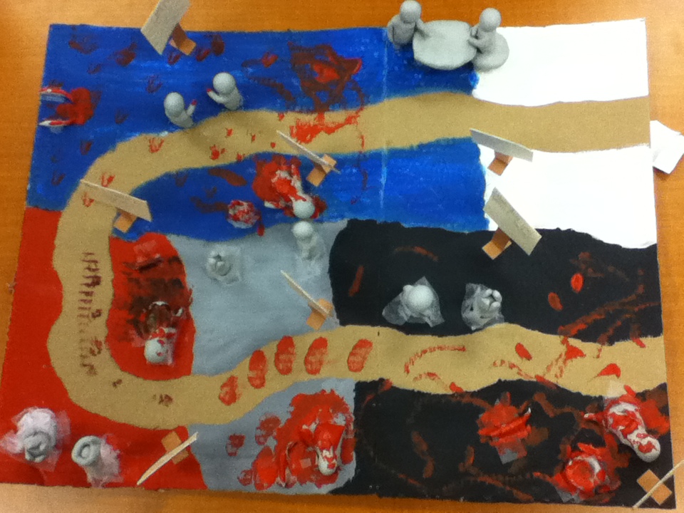 For my creative part, I decided that I wanted to make something out of clay. There is a road in my project to show that it is like a journey. The clay models are there to show what is happening in each scene. Along the road, there are signs that have the quotes on them. The rod is to show that we're on a journey. The journey begins in the white section and the color white is used to represent that Macbeth is pure in the beginning and that he still has loyalty in him. The nest would be the blue section, in this scene Macbeth had just finished murdering King Duncan, and his quote was talking about how all the ocean cannot wash the blood clean from his hand but instead he will make it red. I painted this section blue to represent the ocean and there was blood all over, showing that it is turning red. Also Macbeth and Lady Macbeth's hand were covered in blood. The next section is painted red because he is becoming more murderous. Also in this section Lady Macbeth and Macbeth are farther apart from each other showing that their relationship is beginning to change. The next section is grey, and that represents that Macbeth is not completely evil yet but is close to it. The clay model of Lady Macbeth and Macbeth are separated even more in this part because Macbeth never mentions Lady Macbeth at all. Finally, the last section is completely black to show that Macbeth is pure evil. In this scene Lady Macbeth commits suicide and Macbeth only has a few words dedicated to her. I arranged the characters so that Macbeth and Lady Macbeth are on opposite sides of the road. Putting them like this shows that their relationship had been split right down the middle because Macbeth no longer cares about her.
