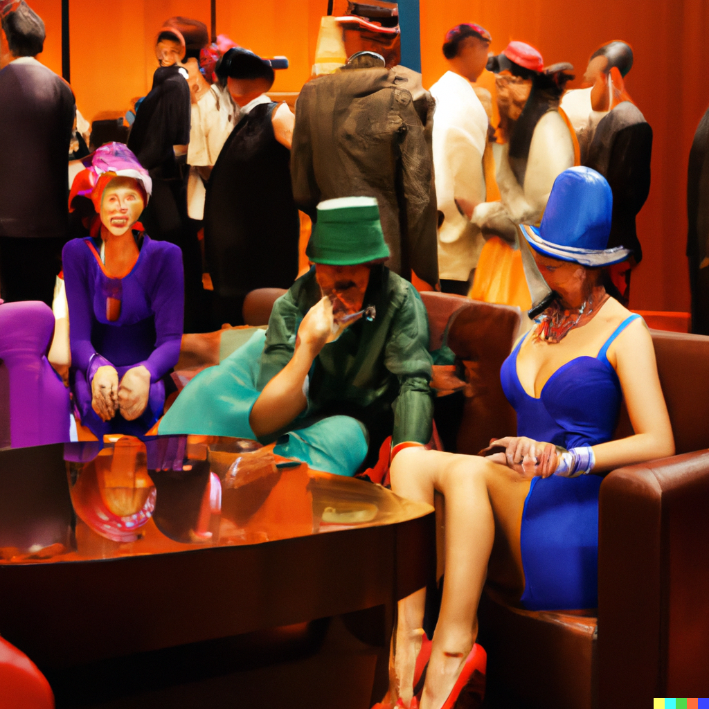 With this, the people at the party became more clear: they seemed to be women, and other powerful figures of Guilead. It seemed like Offred immediately understood what this meant. She had been living in this awful society for so long, valued solely for her reproductive use and literally named after the commander (Of-fred). Yet with all of this, the people of power in Gilead were hypocrites?! Blatantly breaking many of Guilead´s rules together in a party setting?! As I read this, I couldn’t imagine many things that would have been more demeaning to Offred. As if things weren’t already bad enough. Because of the obvious significance, choosing this to create an art piece was a no brainer. For my piece, I used a platform called ¨Dall-e¨ to make an AI generated image. In generating the image, I described ¨a hotel lobby party with fancy women and commanders lingering, with a couch at the front where a woman and man sit¨. I was pleased with how the image included everything, but what I like most is the blurriness. In Offred’s description of the scene, it seemed crazy, secretive and mysterious. The level of the blurriness did a perfect job of portraying all the knowns (Offred gave us) of the scene like the fancy outfits, couch and lobby - yet making it unclear: open to interpretation.