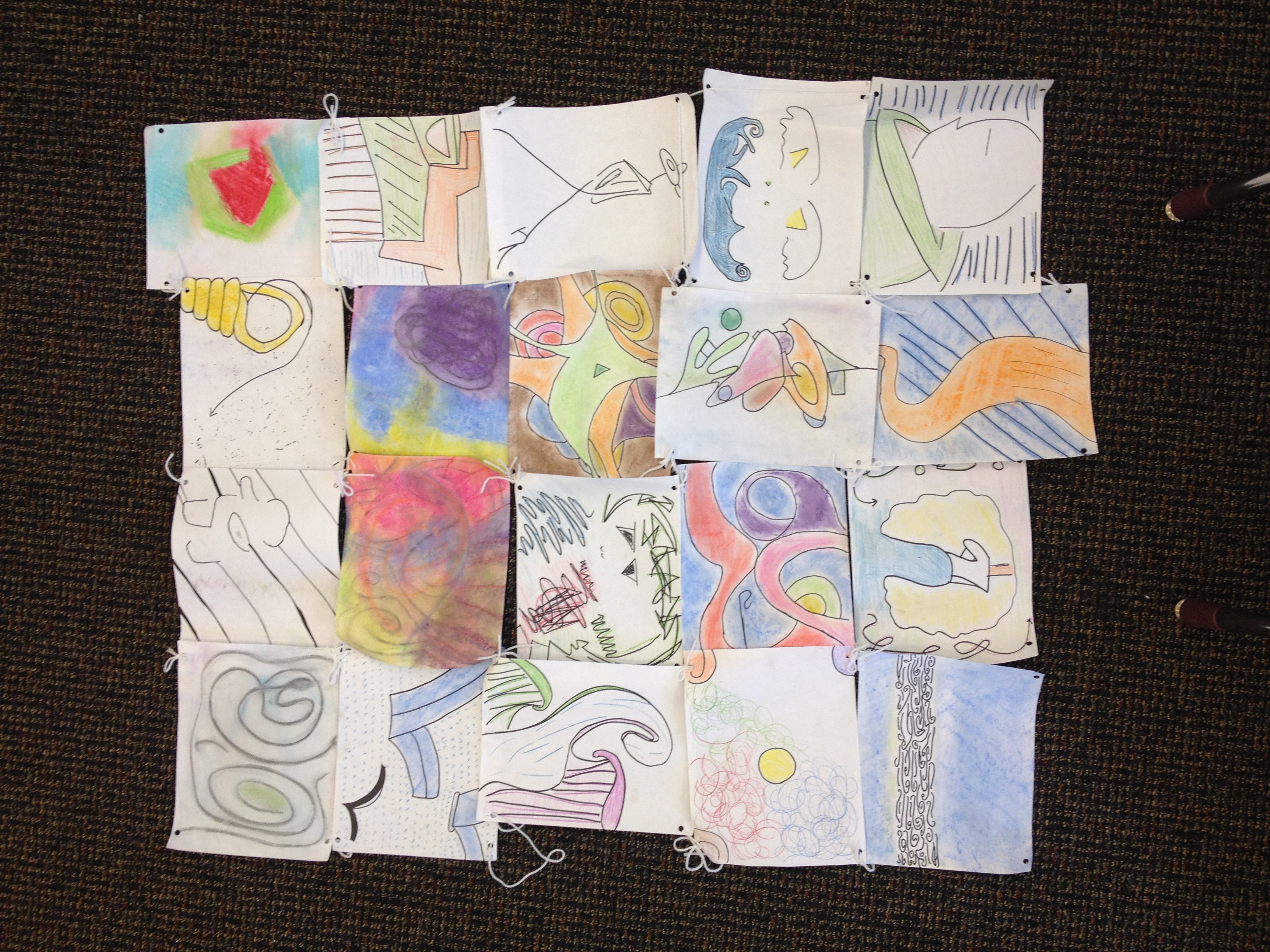 The steps I took to complete my quilt weren't as simple as I thought they would be. I first gathered my materials which was yarn, scissors, hole puncher and my abstract drawings. I first hole punched my drawings and then connected them together with yarn. At the time, I had both landscape pictures and portrait pictures so it was hard to attached them together but I finally got it in the end.