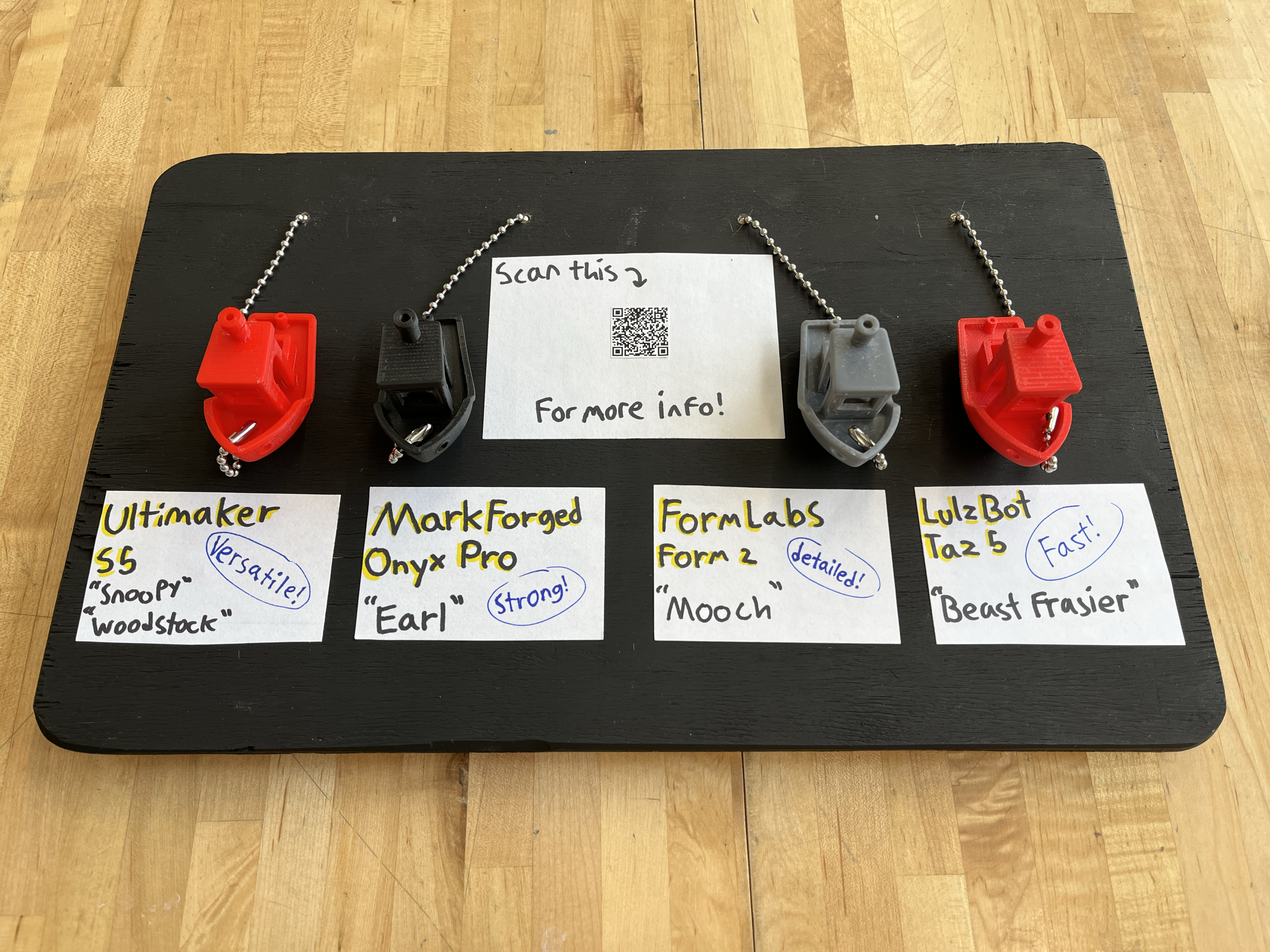 For my capstone project, I created resources to help new engineers in SLA get their footing. I started by labeling each machine with easy to read, laminated cards. Then, I focused on the laser cutter, which was about to endure the Rube Goldberg project, which uses it heavily. The guide that already existed was bare-bones, so I added a lot more detail. After the laser cutter guide was finished, I was unsure of what to do next. That’s when mr. Kamal introduced me to the wonderful world of 3D printing. Over a few months, I wrote tutorials for all four printer models in the shop. Each tutorial is connected to a 3D printing master document. It has a set of stats comparing each printer alongside recommended uses. For example, the Form 2 is arduous to use and clean, but the result is beautifully smooth. Alongside the master document, I printed the same model on each printer. I chose 3DBenchy as the example model, which is a small cartoon boat commonly used to calibrate printers. I then mounted them side by side. Using the mount, a beginner can scan the QR code and reference the example prints to decide which printer to use. Overall, this project was engaging the whole way through. I never thought I’d be interested in 3D printing; it always seemed too limited to be useful. I’m more excited than ever to learn more, and maybe even get a printer of my own in the future.