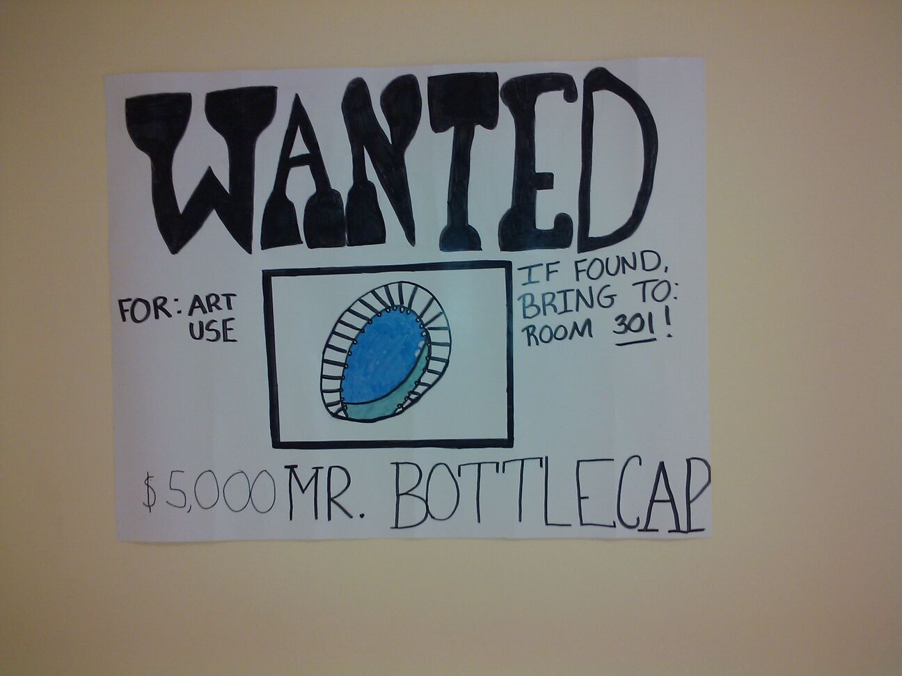 This is my bottle cap poster that I took a picture of today. It has been hanging up in the halls of SLA for a few weeks now. Someone decided to add $5,000 at the left hand corner, I did not put that there. I hope that the students of SLA saw my poster and then remembered to bring in bottle caps to school because that is the purpose of this poster. Bottle caps were being collected from everyone in school so we could recycle them. I wanted my poster to be unique and clever so I figured that the plastic bottle caps were really wanted in the art room that I would make sort of like a warrent for Mr. Bottle Cap. I knew people would understand why we needed the bottle caps if wrote that the bottle caps were needed for art use.