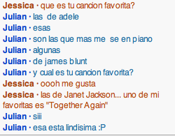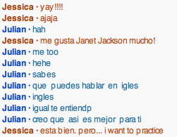 Even though this was the first conversation we've had, I feel like I wasn't as nervous as I was when I did my first chat with the other person on Livemocha. I also think I did better with asking questions, and using Spanish throughout the conversation.