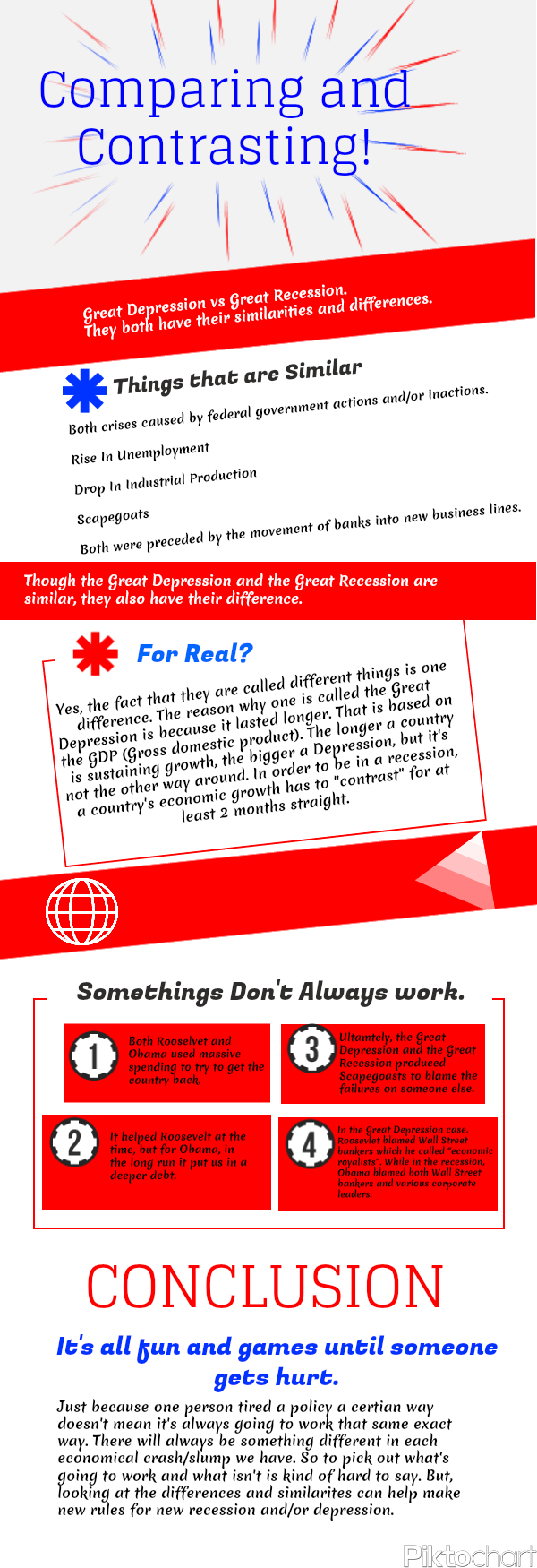Me and my partner did a Piktochart. It introduces people into what the topic is going to be about and then begins to talk about 2 things and link them together. Essentially, all of the charts are linked together. There aren't a lot of words because I personally didn't want to overwhelm people with it. So, I tried to make it consistant and 'sweet'.