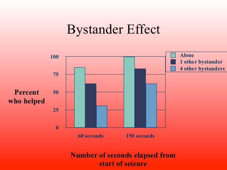 Bystanders can also be influenced by the number of people around the situation. People are more likely to intervene when there a few people to no one. But the more people their are, the less they are to intervene. When people don't react, other people think it is okay to do the same.
