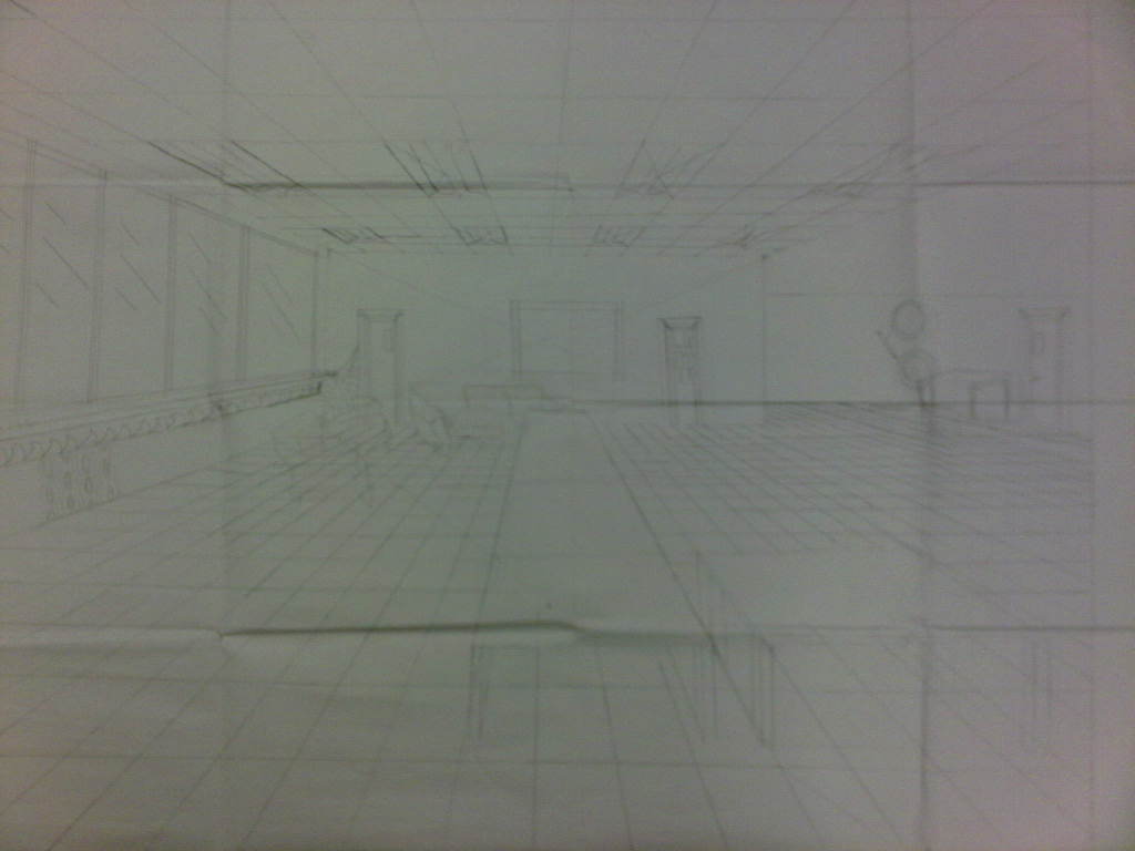 We started this project with an horizon line and that and making a box and figuring out what lines you would see. I stared off with a small back wall and then I found the vanishing point to make the side walls. Then I measured out the floor and the top wall to make tile. then from there it was filling it in with detail with the furniture and the doors and paint. I was easy to learn how to make back walls and doors. It was hard to learn how to make the window sill.