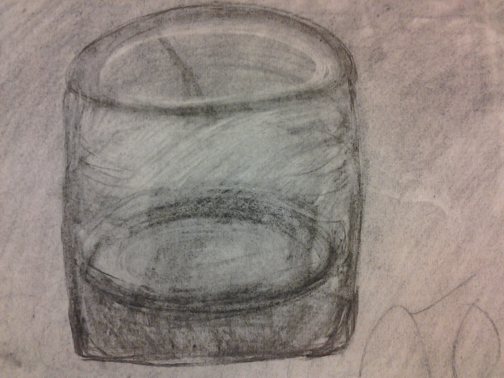 For this assignment we had to draw a clear object. In class we'd pick a clear object of our chose and we'd draw it. The picture was draw using charcoal, in it we us shades of high lights and low lights to create the effect of a clear object. Using my eye I pointed out all the different shades making it easier to draw the object. The darkened background creates a better effect for the drawing making it more realistic.Since is the 2nd clear object I drew it was easier for me to draw and this time I drew it within a few minutes rather than an hour.