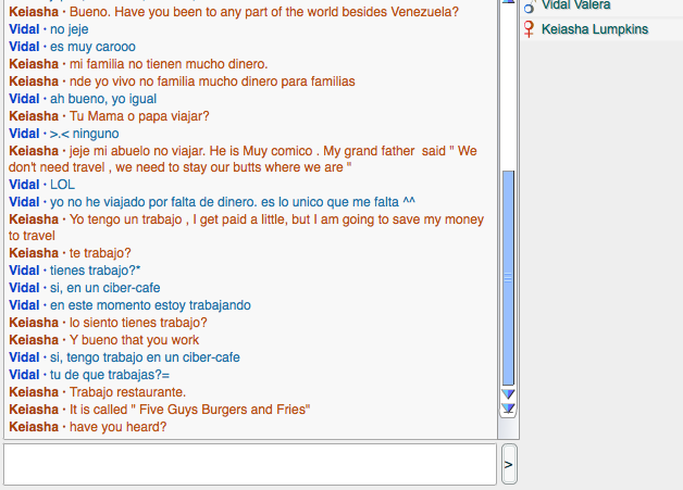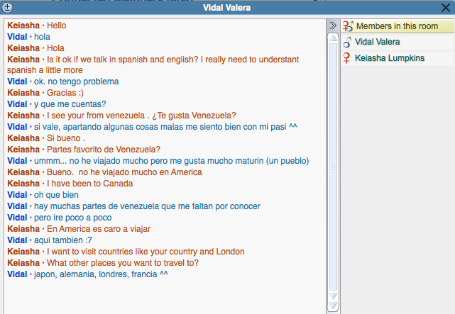 I spoke with Vidal from Venezuela. I Choose him because he was learning English but was a spanish native. He also started talking to me first so I thought why not create and continue the conversation. He also likes sports like me.Also his conversation was getting a little more interesting than the others because, he ask questions and helped me when I was wrong.What did you learn about them? What did you learn from them?