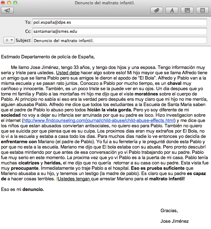 Mi ensayo estan dos correos electrónicos escrito por Jose (el padre de Alfredo) a los autoritarios. Jose dará información del abuso que Pablo recibe de su padre. Tendra evidencia de este maltrato infantil.