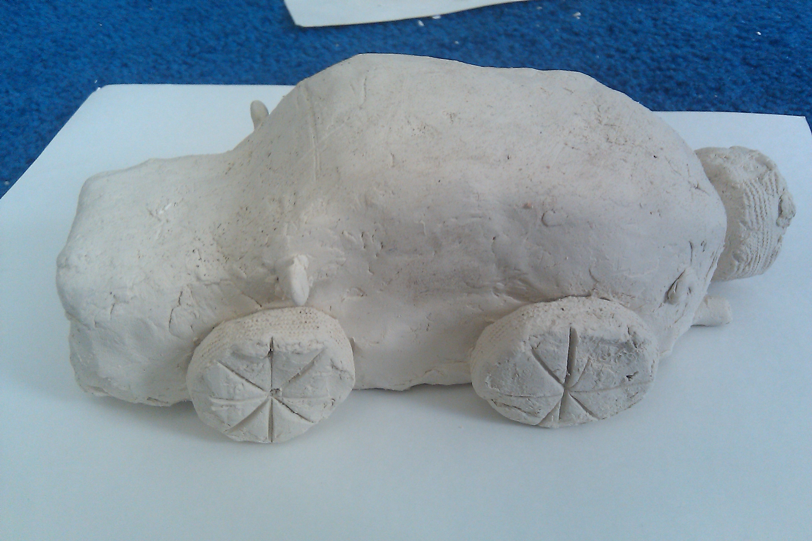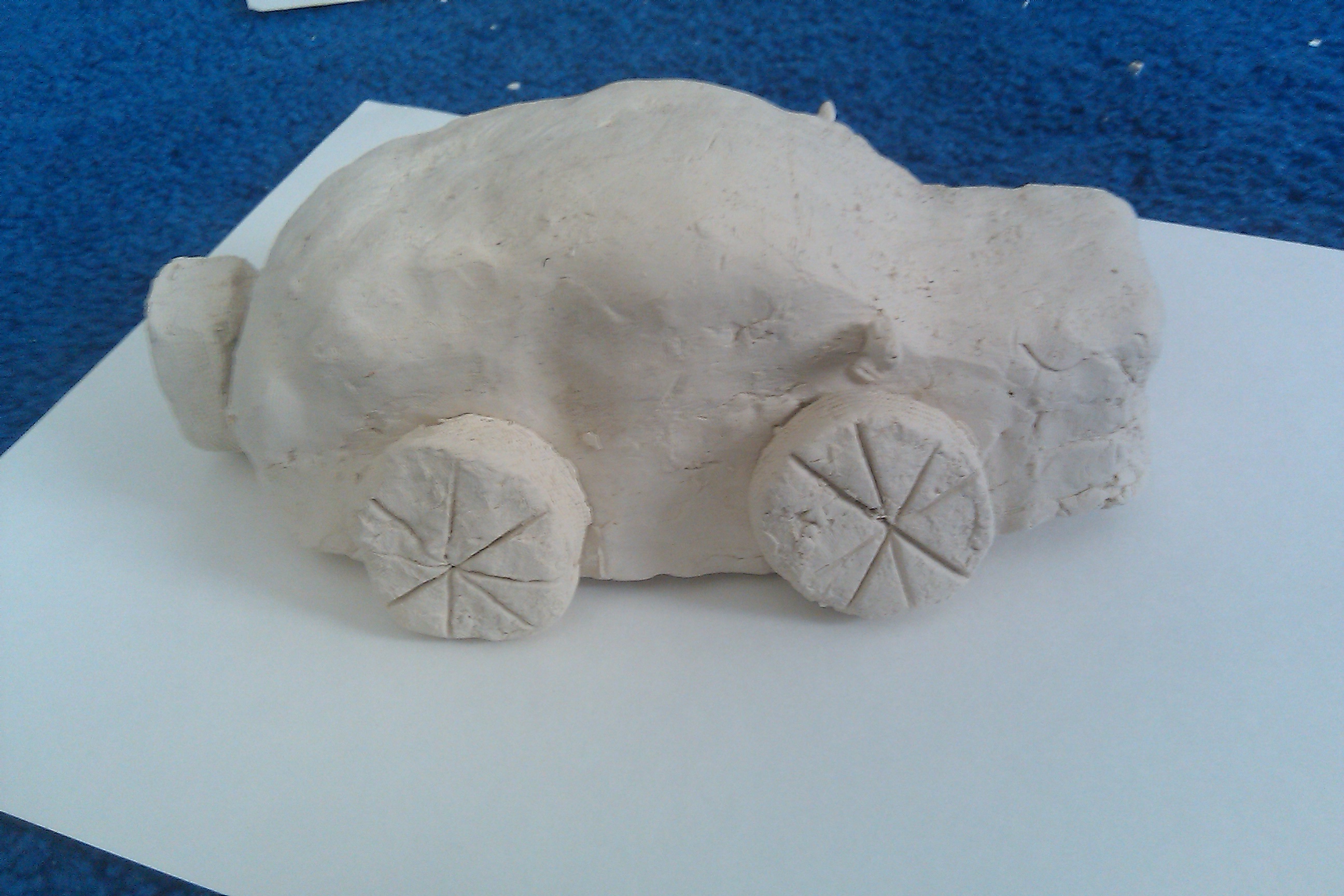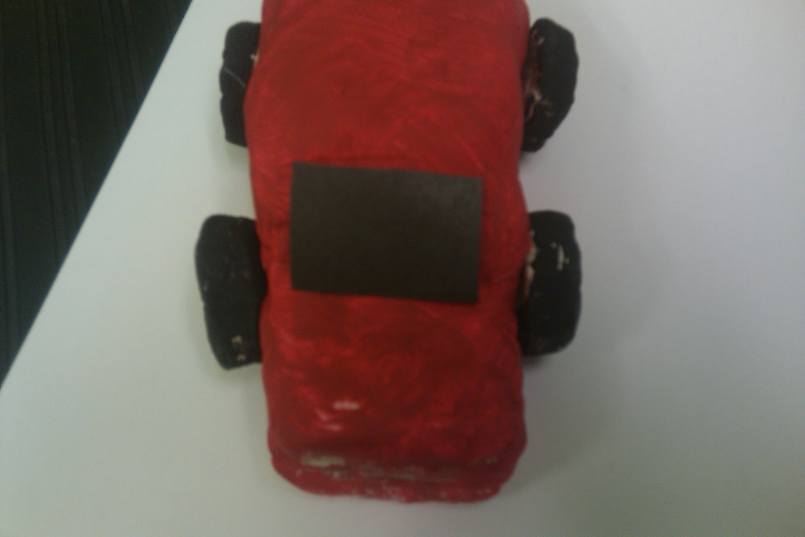 After four or five days the clay was soft enough for me to mold. I started by creating the basic shape of the Infiniti FX. After allowing the clay to harden a bit, I used a sewing pin to add small features to the car as in the roundness of the bumper, and curves to the door. The next week, I deciding to make the tires. I created the tires by rolling modeling clay into a ball in my palm. Once the clay was shaped in a sphere, I slowly flattened the sphere so it can resemble more of a tire. Once I had a basic shape, I used my finger to create the depth of the tire. Once I’d finished creating five tires using the same method, I used the wheel of an actual toy car to create the ridges of the tire wheel. With the left over clay from the wheels, I made two rear view mirrors. The rear view mirrors had to be proportional to the SUV, so I had to make at least several different models before sticking the final model to the SUV. After creating the wheels and mirror, I used two sewing pins to stick the wheels to the side of the SUV. I did this for two reasons: One, they were almost guaranteed to stay on the SUV without any problems and two, the pin allowed the wheels to turn as if they were real. After sticking the wheels and mirror on the SUV, it was time to paint. Since the modeling clay was still soft after leaving it in warm water for so long, I had to wait at least a week for the clay to harden completely. After the clay hardened, I painted it after school in my art studio.