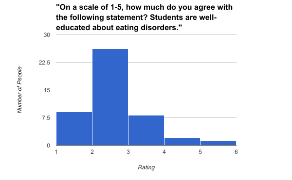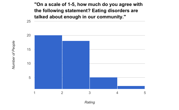 To see how students felt about eating disorders in our community, I asked about what they knew and felt. On a scale of 1-5 (1 being “I disagree completely” and 5 being “I agree completely”), students were asked to rate how much they agree with a statement. Most rated a “4”, for whether or not they feel eating disorders are a problem in our community. What’s outrageous is that not a single student said that they completely disagree that eating disorders aren’t a problem. That means that every student to take my survey thought that eating disorders are at least a little bit of a problem in the SLA community. Most people also rated a “2” on the statement “Students are well educated on eating disorders.” Therefore, the majority of students who took my survey think that we should learn more about eating disorders. I agree with this, because I have never, in any health or eating course, learned about eating disorders. I was never talked to about eating disorders, I learned about these disorders from a book and the internet, like a large number of my surveyors. Most of the people who took my survey also agreed that eating disorders aren’t talked about enough in our community, which I personally agree with.