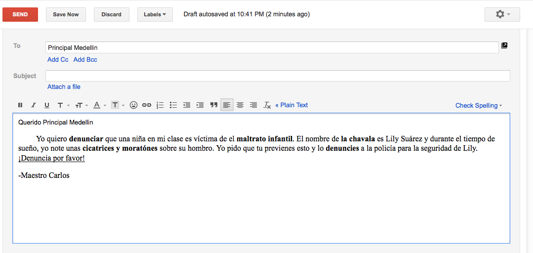 Yo quiero denunciar que una niña en mi clase es víctima de el maltrato infantil. El nombre de la chavala es Lily Suárez y durante el tiempo de sueño, yo note unas cicatrices y moratónes sobre su hombro. Yo pido que tu previenes esto y lo denuncies a la policía para la seguridad de Lily. ¡Denuncia por favor!