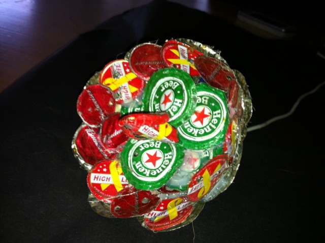 In our senior art class, we were exploring the topic of recycling and the environment, primarily focusing our attention on bottle caps. For my project I choose to make flowers out of bottle caps. Unlike plastic bottle caps, beer-bottle caps can be recycled. Beer-bottle caps are made from steel, as evidenced by their attraction to magnets, and steel is a recyclable material. I wanted to make flowers out of the bottle caps, because quite frankly I think real flowers are a waste of money-they’re beautiful for about a week and then they die. So this bottle cap flowers last for as long as you want. You won’t feel bad about throwing them out either because they can be recycled. My dad helped me with the cutting and flattening of the bottle caps, because he didn't want me working with power tools...but I glued and tied the red bottle caps on the big flower and the medium one.